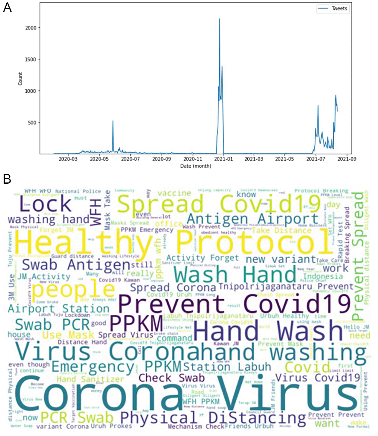 Figure 2 showed the peak counts of tweets were seen in three parts during this period of time. In June 2020; in January 2021 and again in July 2021. The word-cloud of these tweets were seen in this figure, e.g. corona virus, health protocol, COVID-19 spread, preventing COVID-19, PPKM (abbreviation of Indonesian government program to control COVID-19), hand washing and physical distancing. Several keywords i.e. PCR (polymerase-chain reaction), antigen swab and transportation protocols dominated the tweets.