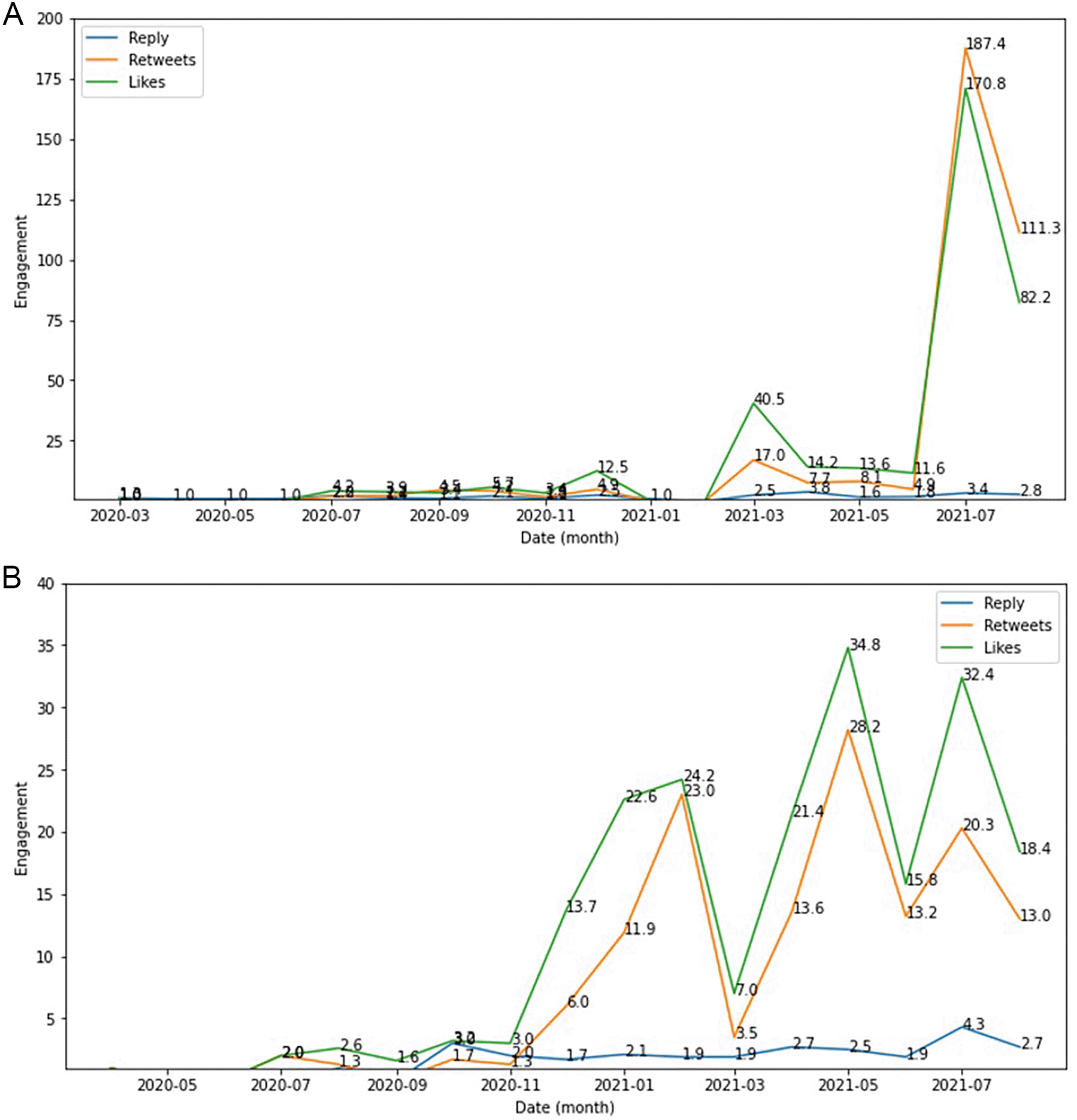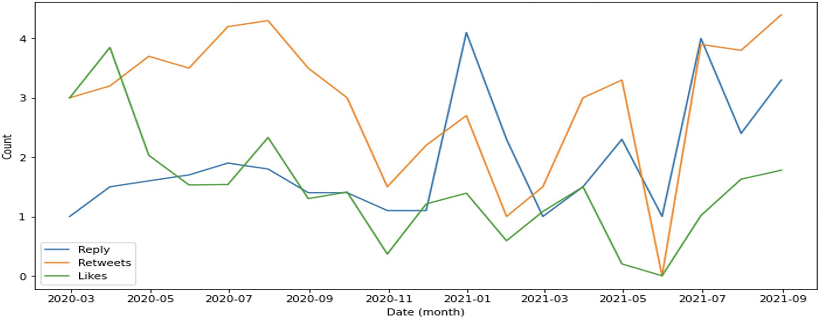 The side effect of COVID-19 vaccine was seen as the engagement topic topped by likes, retweets and reply which were higher in December, 2020; in March, 2021 and in July, 2021 compared to other months during this period. Whereas the type of vaccine engagement showed higher in February 2021; in May 2021 and in July 2021 compared to other months (Figure 6).