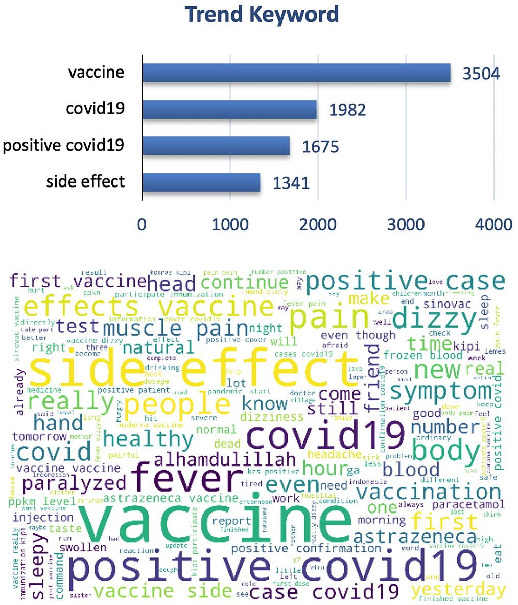 The graphs and word cloud show that of the vaccine side effects subtopics recorded, the word most frequently discussed in tweets was COVID-19 vaccine and its side effect (Figure 7).
