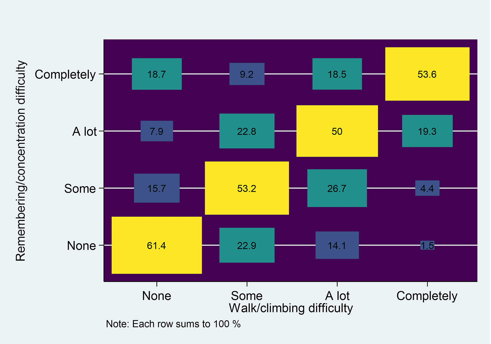 An overview of the dataset regarding the relation between remembering and walking disability is presented in Figure 1. 61.1 per cent of the elderly population aged 60+ years who did not have remembering difficulty also did not have walking difficulty, and only 1.5 per cent could not walk. This marked correlation is also clear when looking at the elderly with some remembering disability since 53.2 per cent also had some walking difficulty. Similarly, 50 per cent of the elderly with a lot of remembering difficulty also had a lot of difficulty with walking. Finally, 53.6 per cent of those respondents who had complete difficulty remembering experienced complete difficulty with walking, while only 18.7 per cent had no difficulty with walking. In general, a greater difficulty in remembering was associated with a greater difficulty in walking, indicating the interface between the two disability conditions.