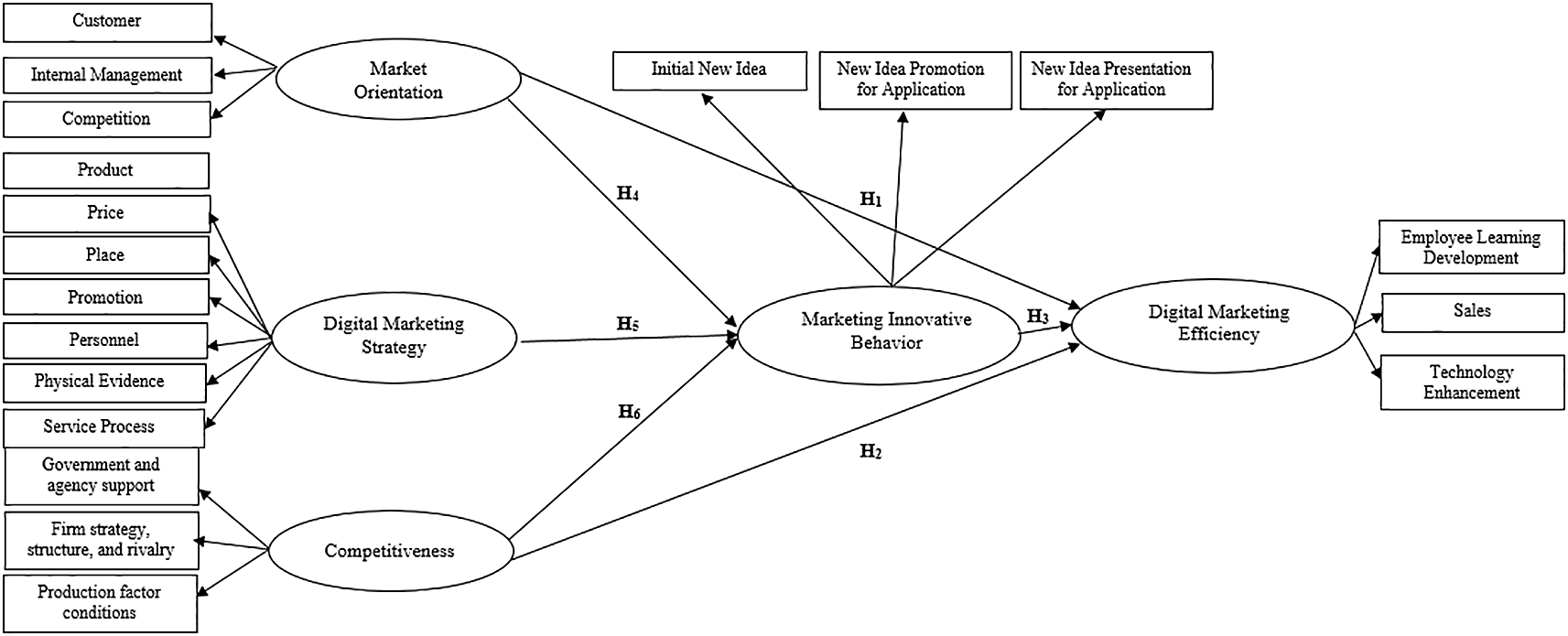 This study also compiled theoretical ideas to explain marketing direction, and Drucker (1985) found that successful entrepreneurs had everything in common: a commitment to systematically managing innovation. For innovation sources, success is the result of attention-seeking innovative opportunities that can be found in a few scenarios. Four sources of opportunity in a firm or industry may come from unexpected events: incompatibility, process requirements, changes in the industry and market, and opportunity sources outside the firm, such as society, government and agency, related and supporting industries, and the environment. These opportunities were business and management challenges such as demographic changes. Changes in perception and the new knowledge and sources mentioned above, both inside and outside the organization, can create opportunities for innovation when the enterprise is at risk. There may be conflicts, and the innovation potential may be in more than one place at the same time, creating innovative opportunities and enhancing the benefits through competitive digital marketing technologies (Wu & Chen, 2021; Wang & Ku, 2020; Zmudzinski & Zaborek, 2018). The research hypotheses can be formulated as follows: