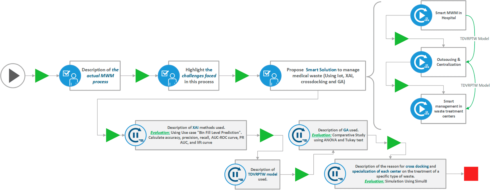We begin by providing a detailed overview of the actual MWM process in the context of Morocco as an example. This includes a step-by-step description of activities such as sorting and packaging, storage, transport, treatment, and disposal. We also highlight the key challenges associated with each stage, such as health risks, storage time limitations, maintenance of appropriate storage conditions, management of flows and vehicle capacity, and compliance with regulations.