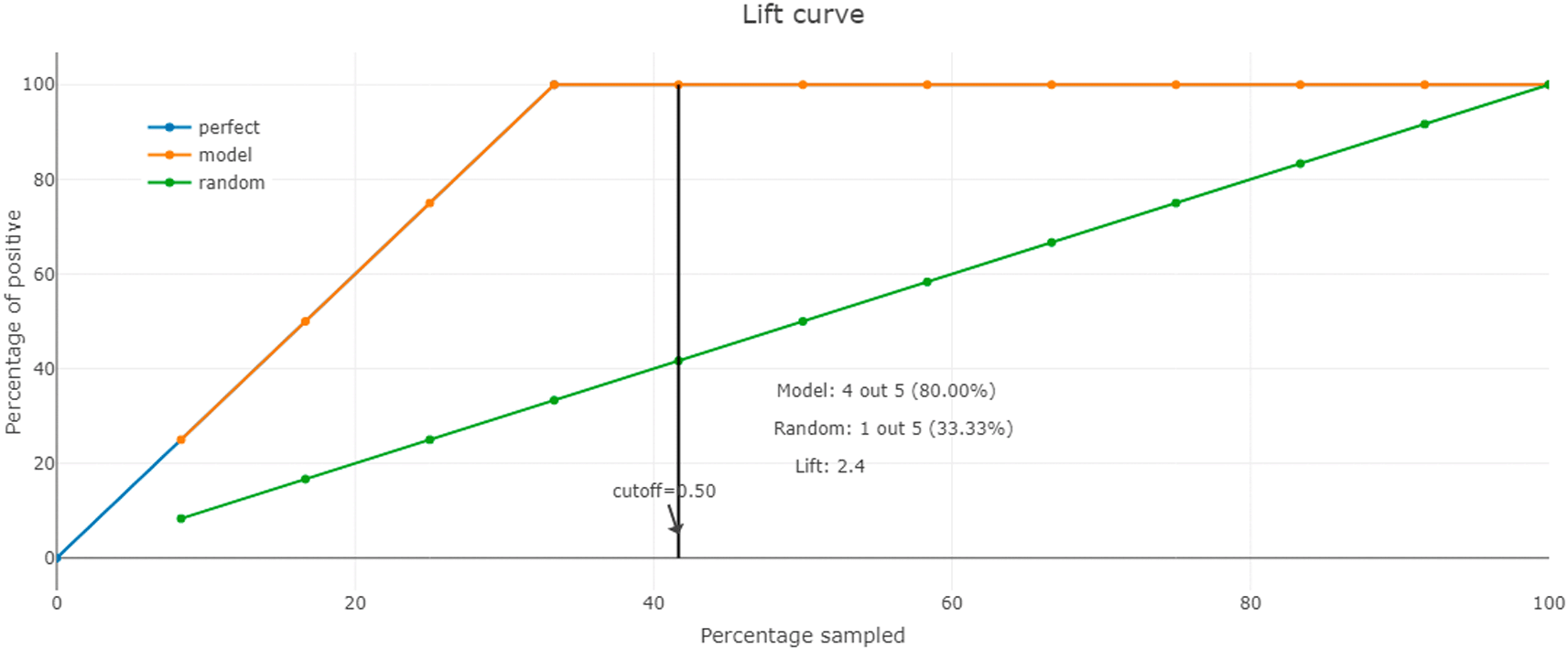 Additionally, we use the lift curve to assess the performance of our machine learning model in identifying the level of filling of waste bins. Indeed, this curve identifies how much better our model is at capturing positive instances compared to a random model.