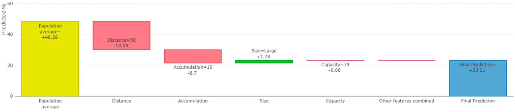 Furthermore, we utilize the contribution graph to represent the SHAP values, showing the impact of individual features on the model’s predictions. Positive and negative contributions indicate whether a feature increases or decreases the prediction, respectively. The contribution graph helps stakeholders easily grasp how changes in different features influence the model’s decision-making process.