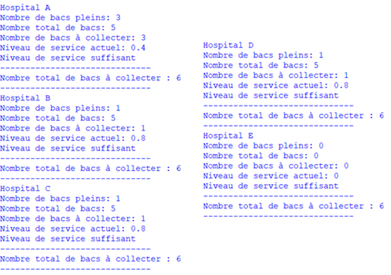 Our study case consists of 10 treatment centers, 4 available waste transport vehicles, each with a capacity of 250 units, this scenario is based on the context of Casablanca. After applying the GA with the constraints and fitness function described above, we obtain an optimal solution that minimizes the total cost of distributing medical waste. The first round consists of transporting the collected waste to the first treatment center, which specializes in the treatment of infectious waste. The other two vehicles begin their rounds at the second treatment center, which specializes in the treatment of radioactive waste. They collect radioactive waste from all nearby hospitals and deliver it to the second treatment center. The cumulative cost of this approach is determined by combining the expenses associated with vehicle travel, fixed vehicle costs, waste collection outsourcing, and the environmental impact resulting from vehicle operations and processing centers.