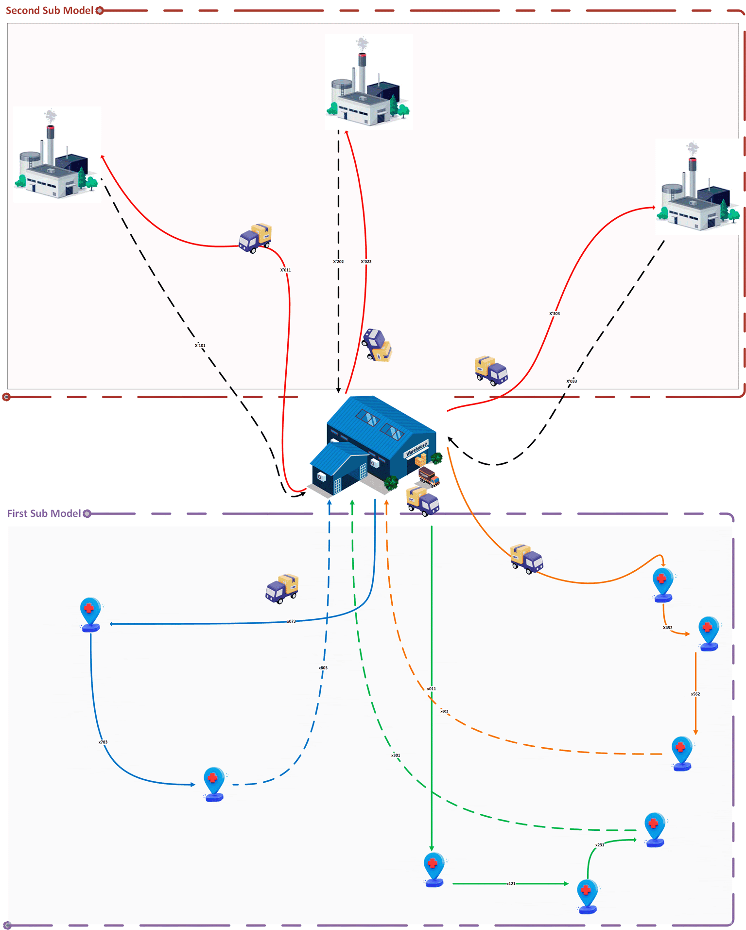 We begin by describing the problem for each sub-model. In the waste collection sub-model, we aim to find the most efficient schedules for waste pickup from different hospitals, considering constraints such as time windows, vehicle capacity limits, and known waste quantities. Similarly, in the waste transportation sub-model, our objective is to determine the optimal routes for transporting the collected waste to treatment centers while adhering to time windows and vehicle capacity constraints.