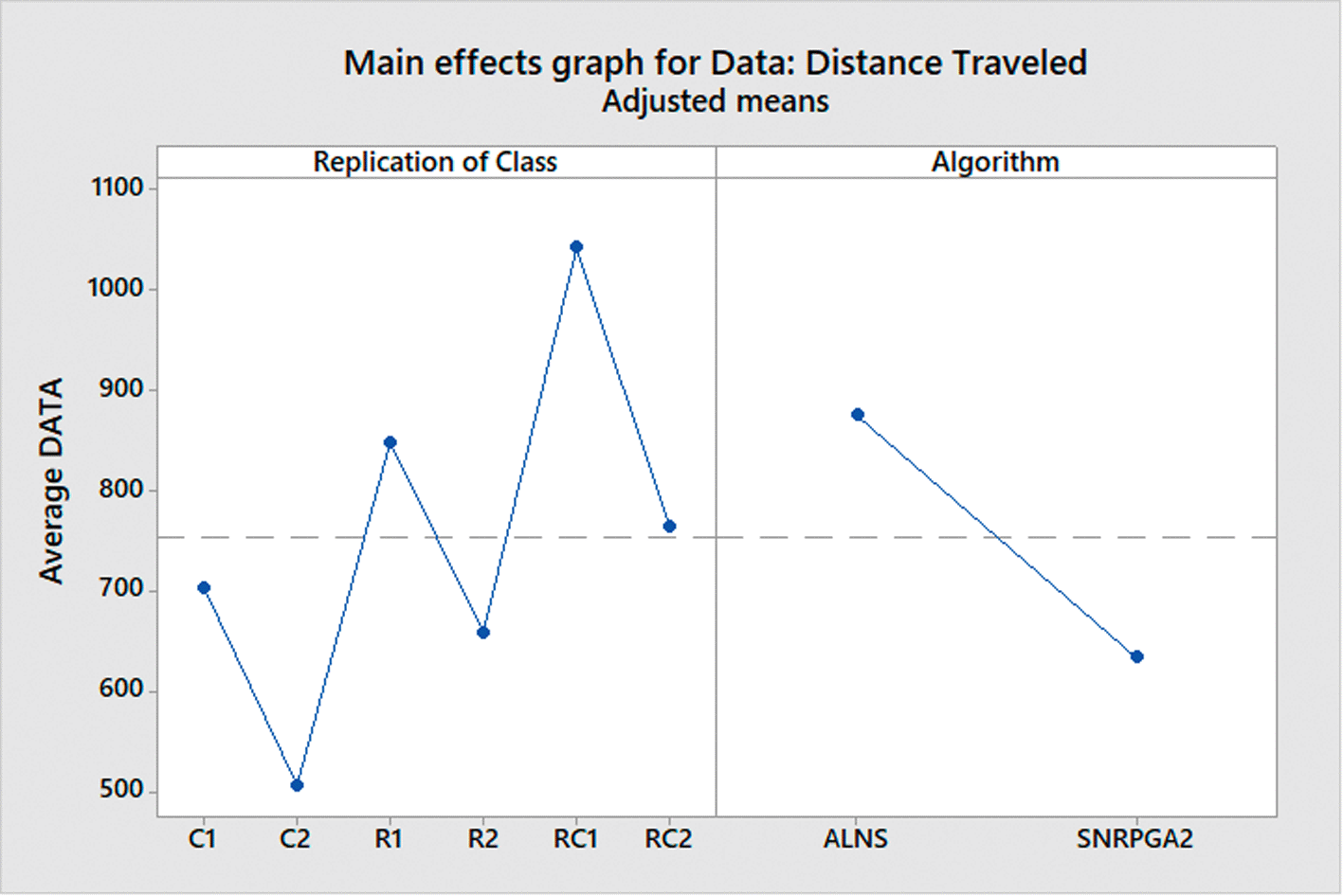 The nonexistence of a substantial interaction effect between algorithm and replication of class indicates that the impact of these two factors on the distance traveled is separate and unrelated. These results suggest that both factors, algorithm and replication of class, should be considered when analyzing the performance of the algorithms.
