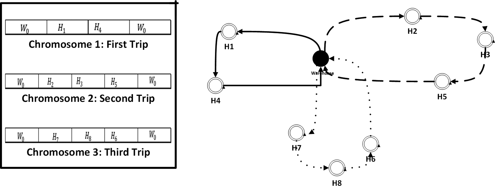 To address the TDVRPTW in both sub-models of MWM, we employ a genetic algorithm (GA) due to its effectiveness in exploring complex solution spaces and finding near-optimal solutions. The GA follows essential steps:
