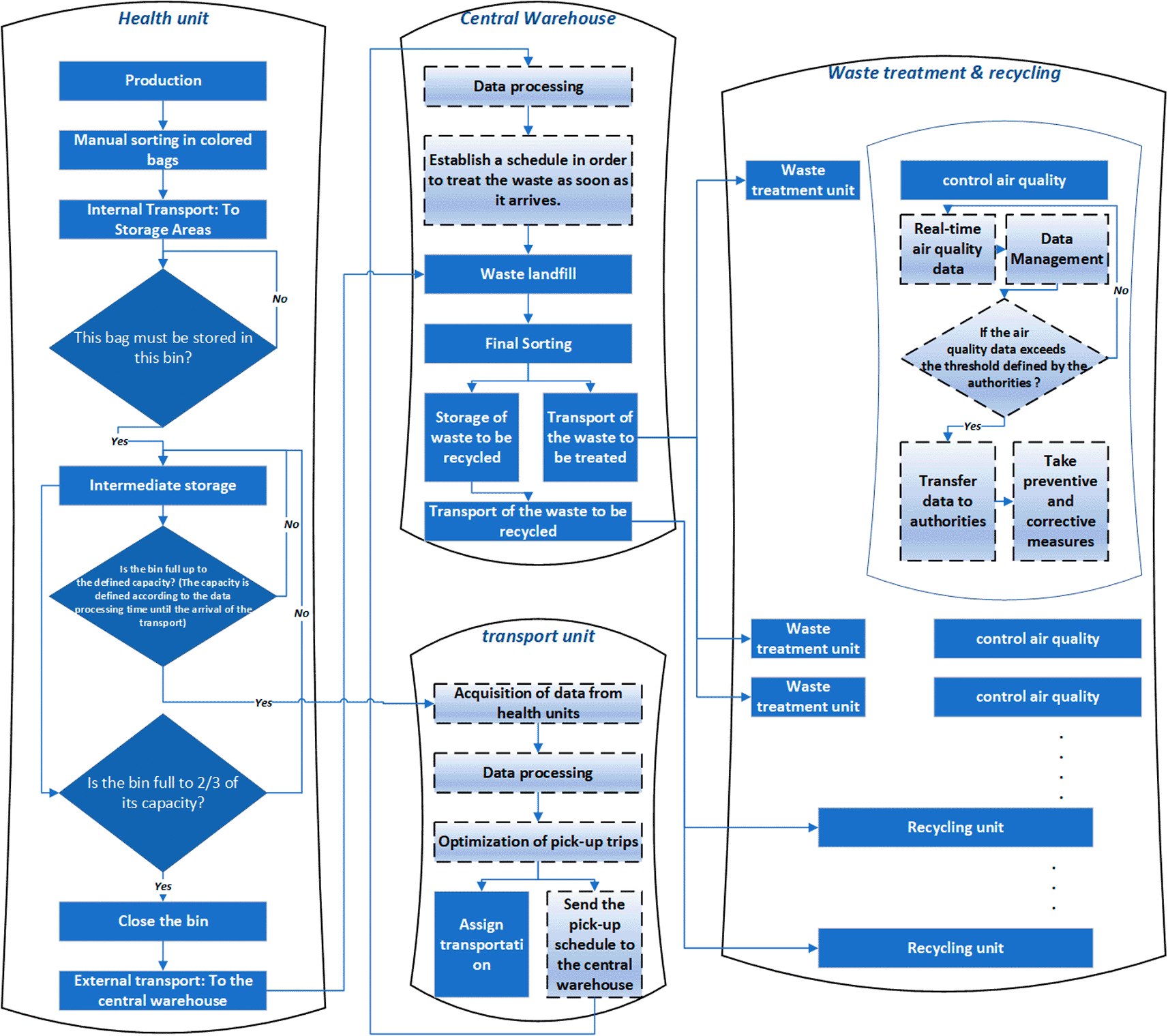 Although some authors use the latest technologies to address the risks of MWM, for example the authors of Ref. 10 proposed a decentralized blockchain-based system to automate medical waste processes and makes it transparent. Their solution consists of four components: medical equipment and supplies, waste centers, recycling plants and sorting factories.