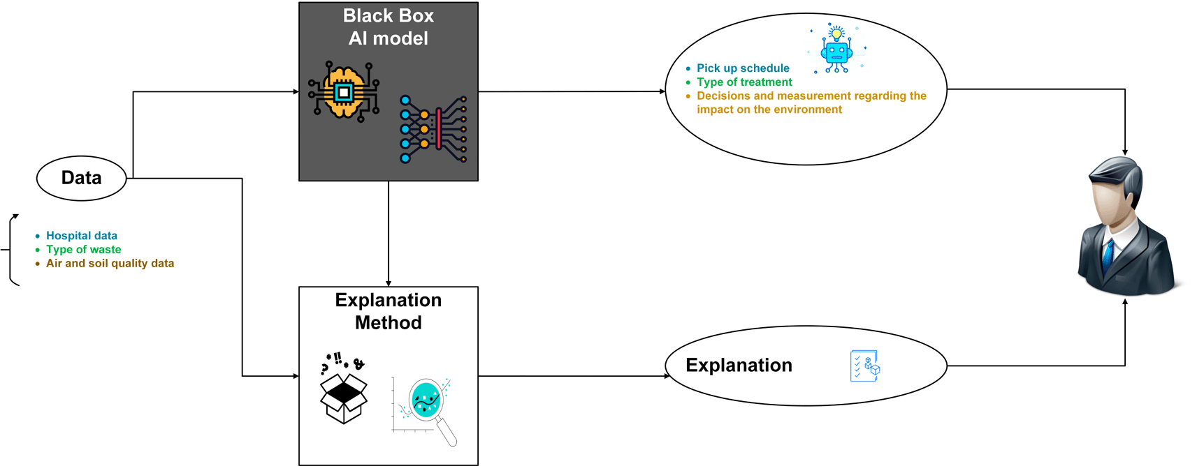 Our contribution goes beyond the use of IoT for waste sorting and tracking, as we have developed a comprehensive smart solution that covers the entire waste management process from generation to disposal. Our approach includes the deployment of smart devices in the hospital, external warehouse, transport vehicle, and waste processing unit, while leveraging AI and big data to optimize efficiency. Additionally, we have proposed a collaboration system among all stakeholders to ensure the success of the solution. Furthermore, to promote transparency and understanding among the involved parties, we have integrated XAI in our solution.