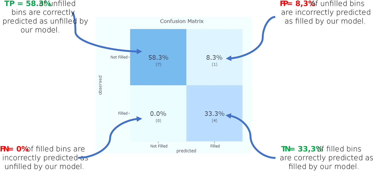 • True negative (TN): The number of correct predictions made by the model for bins that are not filled to the expected level. These are bins that the model correctly identifies as not requiring immediate attention.