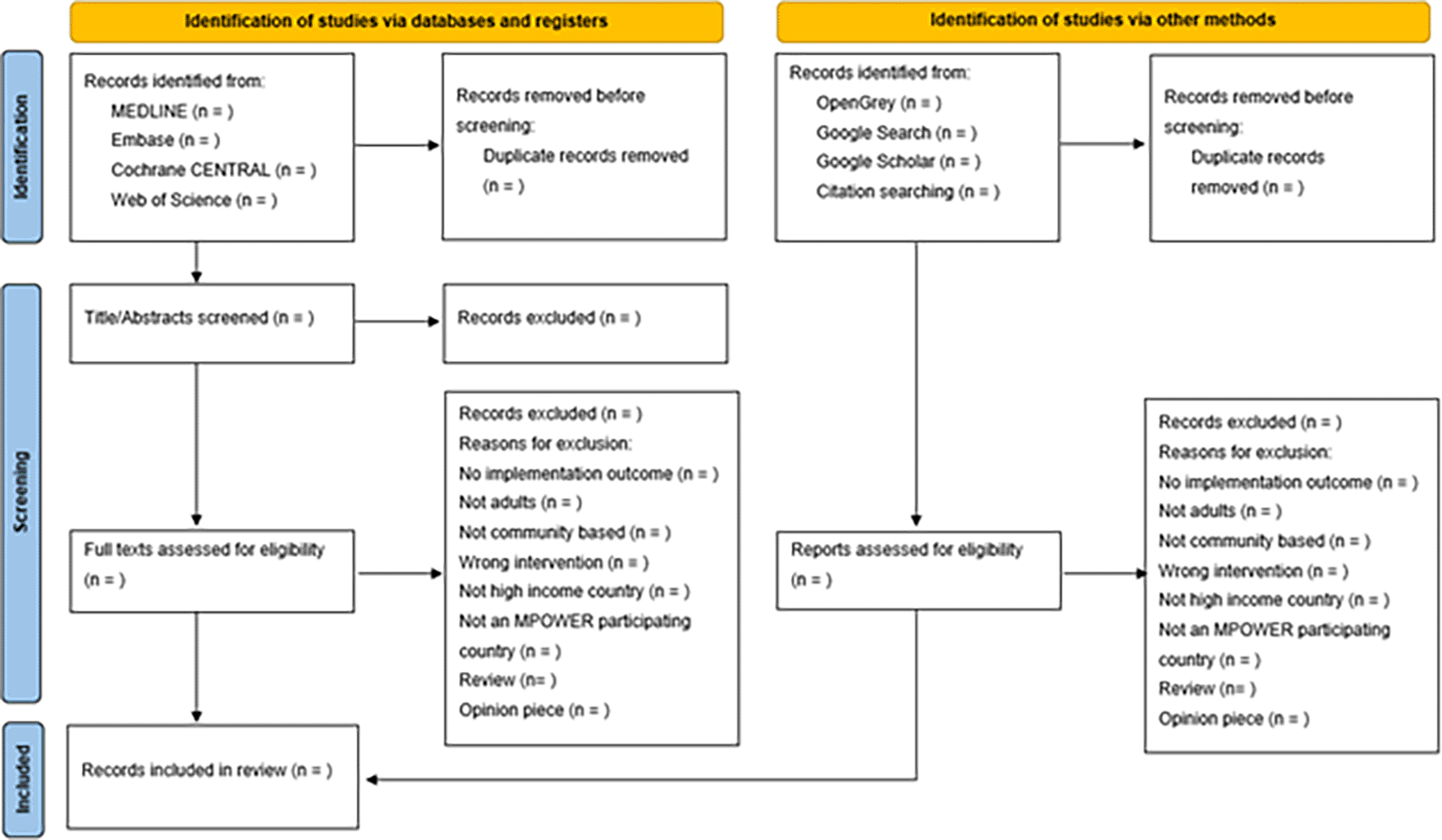 We will search for studies reporting the following: a smoking cessation intervention or program in which implementation was prospectively planned and/or delivered and broadly incorporated; (1) implementation strategies and, (2) an implementation theory, model, or framework, or other factors that influenced planning and delivery of implementation as defined by the authors. The search strategy will be organised and adapted to each database to capture key concepts using Boolean operators. Keywords and MeSH terms will be used to search key concepts including smoking cessation, smoking cessation services and interventions, and implementation evaluations. Search terms were developed and refined through discussion with the author team and in consultation with a research librarian. The search strategy to be used for the databases of MEDLINE, Embase, Cochrane CENTRAL, and Web of Science is provided in Table 3.