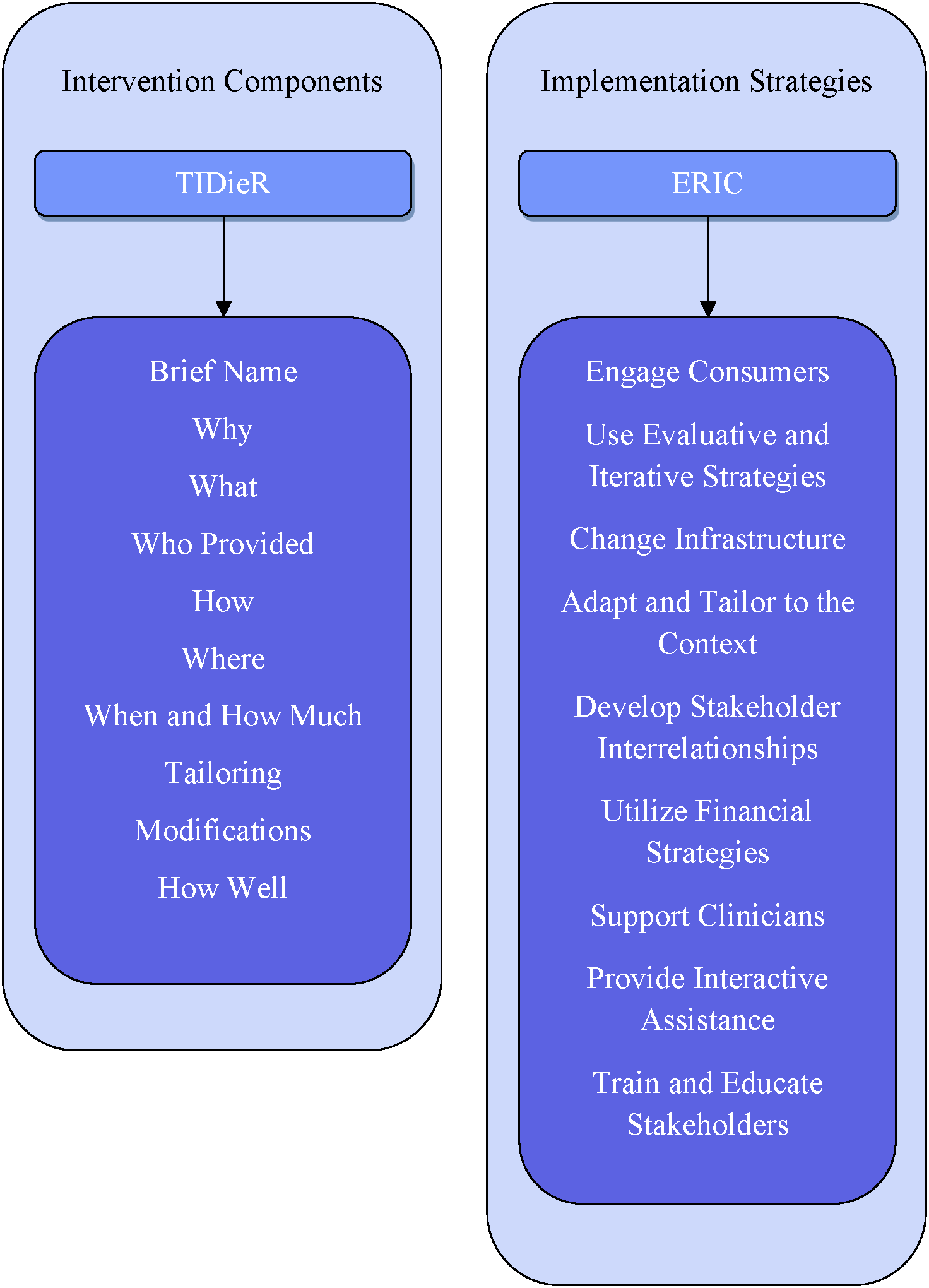 Quantitative and qualitative data will be analysed separately and presented narratively, graphically and with the aid of tables and figures where appropriate. Reported findings will include: (i) intervention components, reported using adapted TIDieR items;54 (ii) implementation strategies, reported using Expert Recommendations for Implementing Change (ERIC) strategy clusters,56 and (iii) implementation theories, models, and frameworks (see Figure 2). Qualitative data that does not fit within the predetermined reporting framework will be analysed via an inductive approach57 and reported separately.
