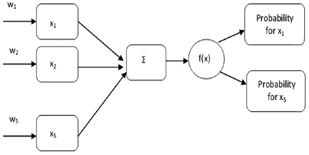 Σ is denoted as the summation of the multiplication between parameters and weights (wi xi); f(x) is the activation function.