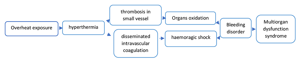 Pollution parameters are directly and indirectly affected by solar activity26. Solar activity contributes to stroke-related mortality (thrombotic events), as demonstrated by previous studies27, although it has been established that it does not to climate change26. Thus, we added the relevant data, herein, for future consideration with future heatwave events. Finally, the 1987 heatwave results were of great importance because confounding factors, such as lifestyle, dietary preference variations, high pollution exposure, and genetic heterogeneity were absent at the time27. Our study was limited to death events reported by the municipality and not the greater area of Piraeus or Athens. The health impacts of exposure to overheating include hyperthermia, triggering bleeding disorder either through thrombosis in small vessels or disseminated intra-vascular coagulation. The resultant bleeding disorder may lead to multi-organ dysfunction syndrome and/or death (Figure 2).
