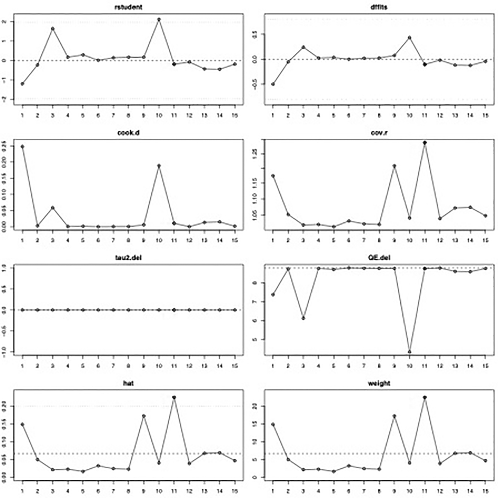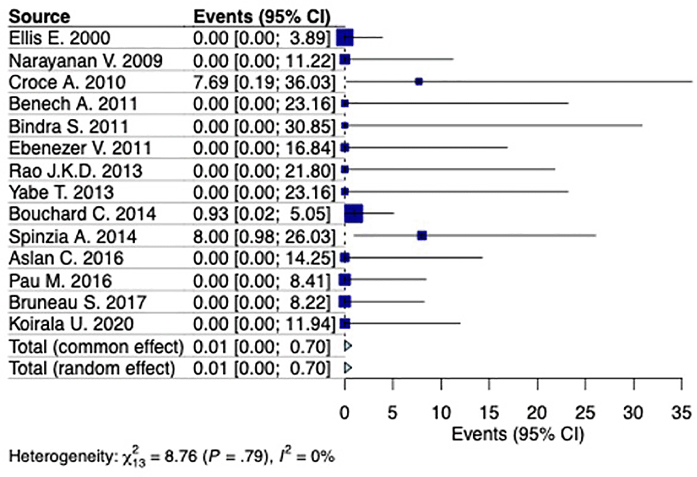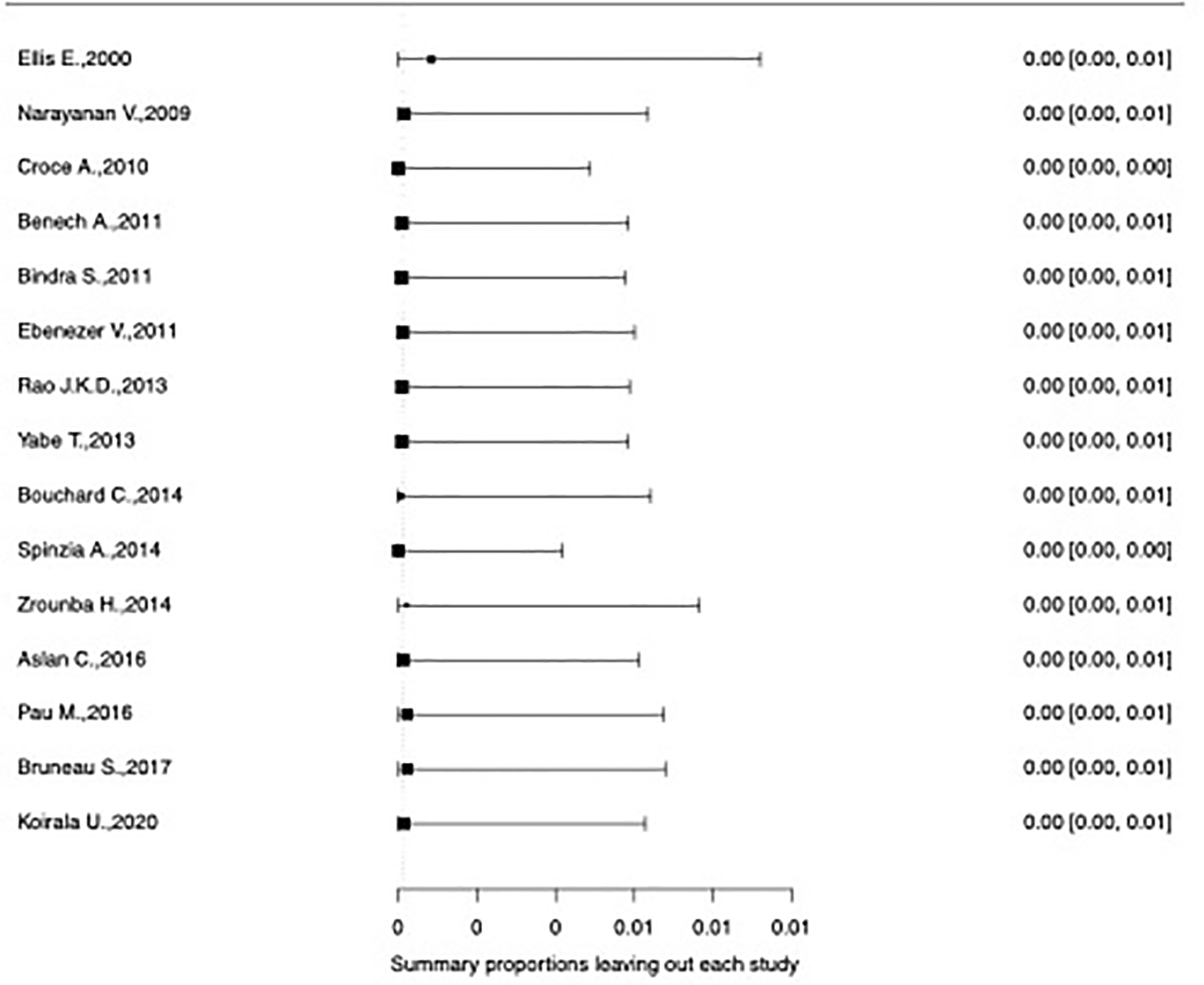 A random-effects model analysis yielded an initial overall Frey syndrome prevalence following ORIF of 0.01% (95%CI 0%-0.59%) with moderate between studies heterogeneity I2=0% (95%CI 0%-44%, p=0.84). The influence diagnostics and the forest plot illustrating the results of the leave-one-out analysis is presented in Figures 2 and 3. As per them, the study conducted by Zrounba et al.38 identified as influential. After the exclusion of the aforementioned study the estimated prevalence was calculated at 0.01% (95%CI 0%-0.7%) with moderate remaining between-studies heterogeneity I2=0% (95%CI 0%-47%) (p=0.79) (Figure 4).