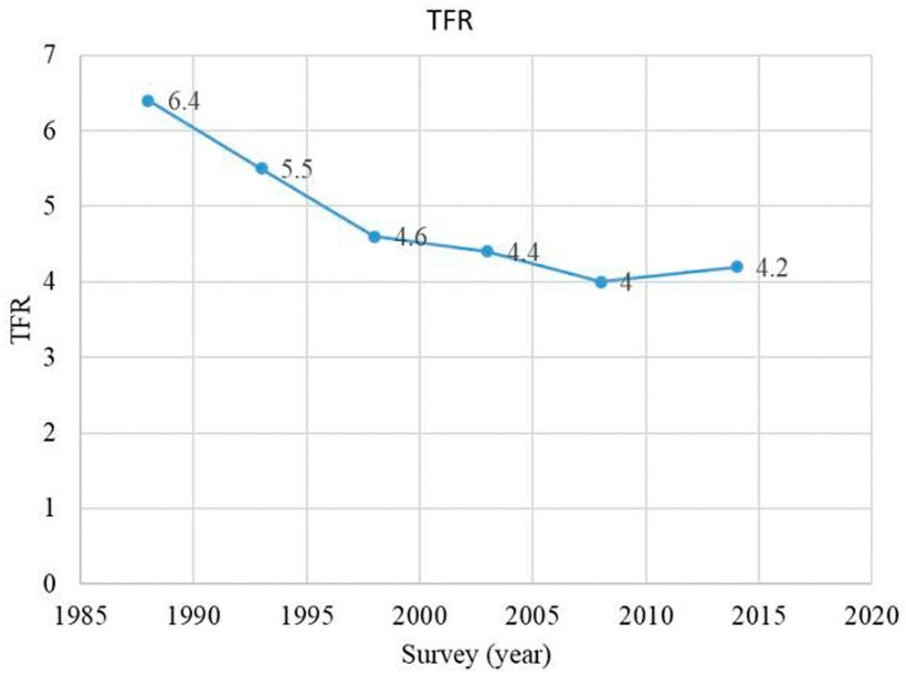As shown in Figure 1, Total Fertility Rate (TFR) in Ghana declined from 6.4 births per woman to 4.2 births per woman between 1988 and 2014. Yet, it is worth noting that there was a decline from 1988 to 2008 (4.0 births per woman), before it slightly increased to 4.2 births per woman in 2014.