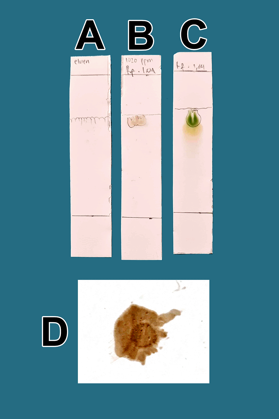 A. Control eluent, t mobile phase, B. Flavonoid. C. Standard quercetin. D. Flavonoid sprayed with ammonium solution giving a red color.