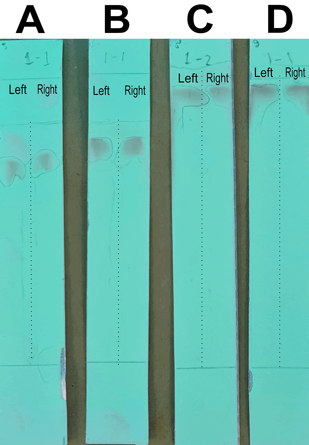 A. Control eluent, t mobile phase, B. Flavonoid. C. Standard quercetin. D. Flavonoid sprayed with ammonium solution giving a red color.