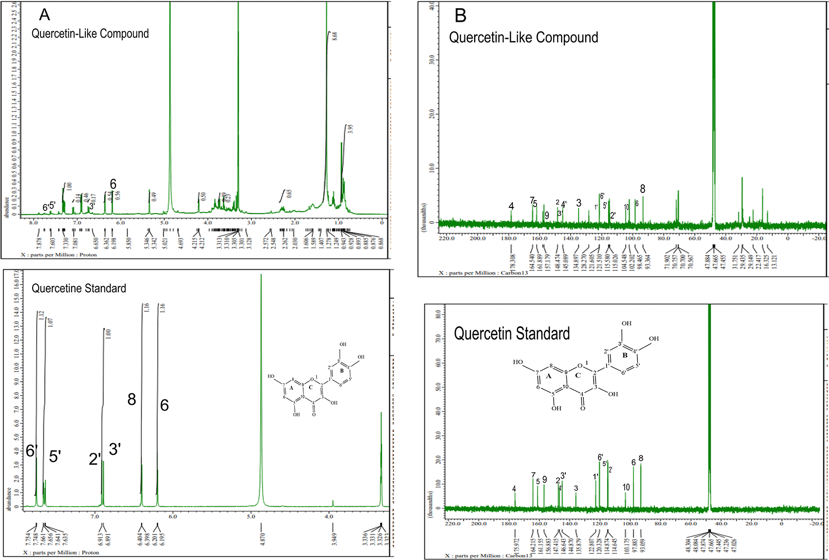 Analysis of proton (1H) and carbon (13C) NMR of standard and analytes was performed using a 99.9% (w/v; 0.36 M) solution standard of quercetin and analytes dissolved in methanol-d4 were acquired using the JEOL JNM ECS-400 NMR spectrometer (Figure 5). This spectrum reveals three types of proton and carbon signals as follows: aromatic protons carbon and hydroxy protons carbon of the analyte and standard, and solvent proton carbon. The main structure of a QLC is a benzopyrone with three hydroxyl group substitutions (positions 3, 5, and 7) and at proton (1H NMR) positions of H-6 δ 6.198 ppm and H-8 δ 6.401 ppm. Other signals for the 2′,5′, and 6′ B ring of the quercetin structure were protonated at δ 6.902 ppm, δ 7.648 ppm, and δ 7. 751 ppm. The carbon NMR (13C NMR) 8, 10 of QLCs were present on the A ring of quercetin at δ 93.059 ppm and the AC ring of quercetin at δ 103.175 ppm. Other atoms of QLCs were present on the C ring of quercetin as follows: 2C δ 147.415 ppm, 3C δ 135.879 ppm, 4C δ 175.972 ppm, and 7C δ 164.215 ppm on the A ring of quercetin, and 9C δ 156.883 ppm on the AC ring of quercetin.