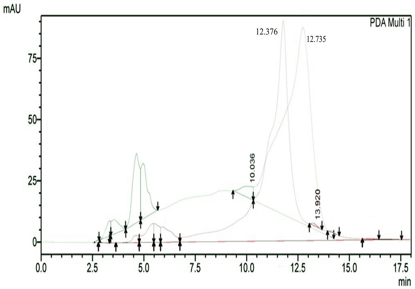 The results of HPLC RT in Figure 3 show the peaks of the analyte (QLCs) in magenta and the standard in green color (Figure 3). The peak RTs of the two chromatograms were similar. The tolerance range between the retention times of analytes and the RT was estimated to be <5 min.