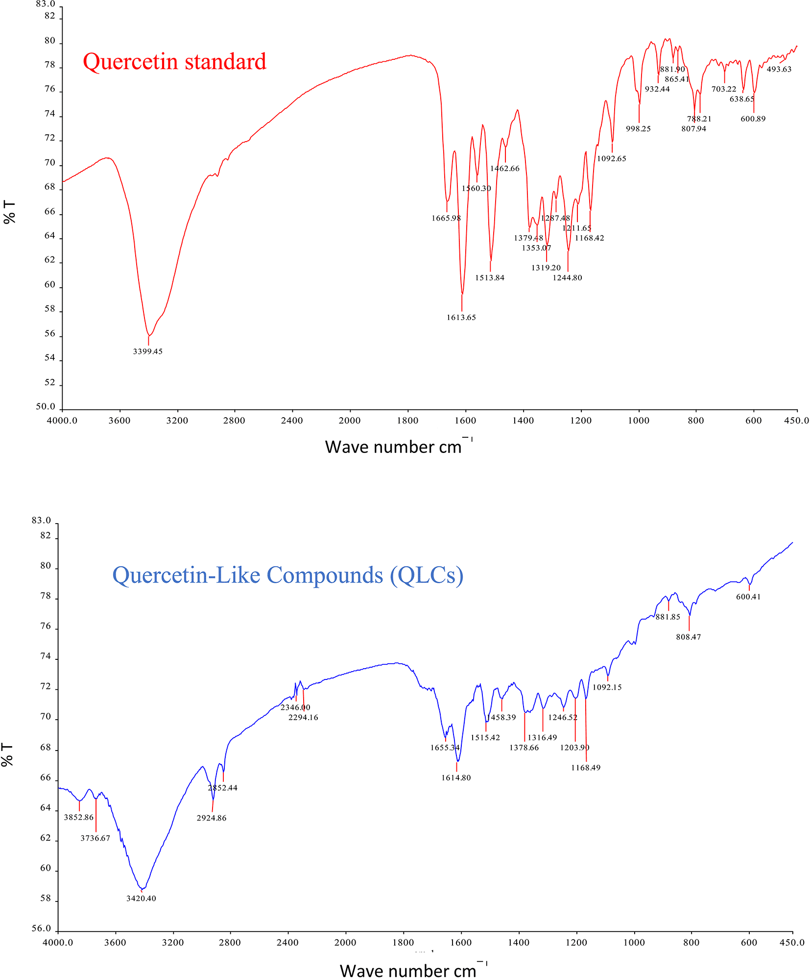 FT-IR analysis is intended to identify the similarity of functional groups through the fingerprint region, as shown by comparing the QLCs (blue spectrum) and quercetin (red spectrum) between 600 cm−1 and 400 cm−1 (Figure 4). However, QLC wave numbers in non-specific areas, namely between wave numbers 1800 cm−1 to 600 cm−1, can also be used as a study of the bioactive characteristics to be investigated. There are two things about FT-IR analysis, there was an IR spectrum with similar wavenumbers between QLCs and standards, but there was also an IR spectrum at certain wavenumbers that do not match QLCs with standards. The mismatch of the IR spectral between QLCs and standards was well understood considering that bioactive withdrawals in natural plant preparations were difficult to draw the purity of active ingredients from disruptive elements. The mismatch of the IR spectrum reaches up to 40% and this was often found in studies using plants as objects of study.41,42