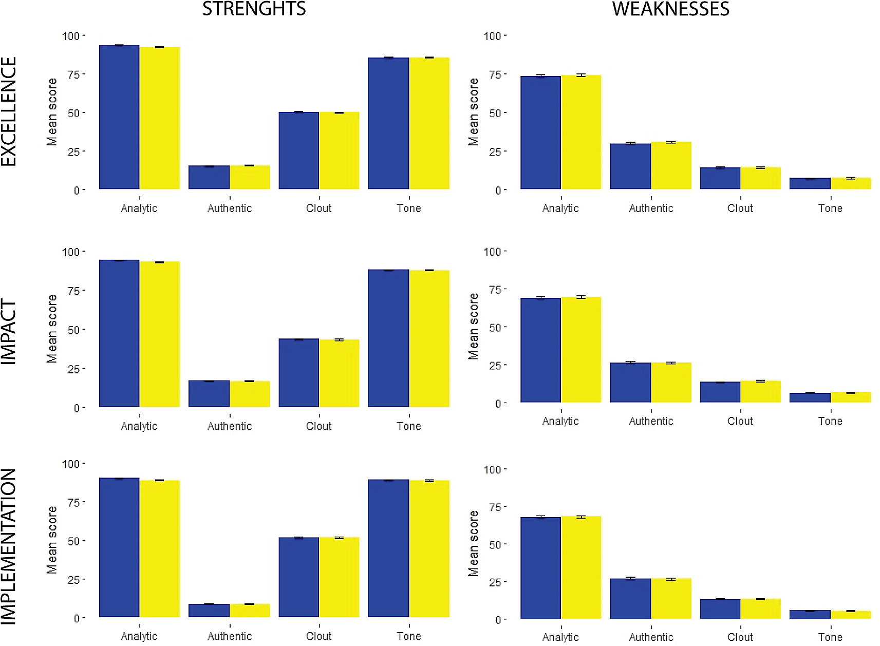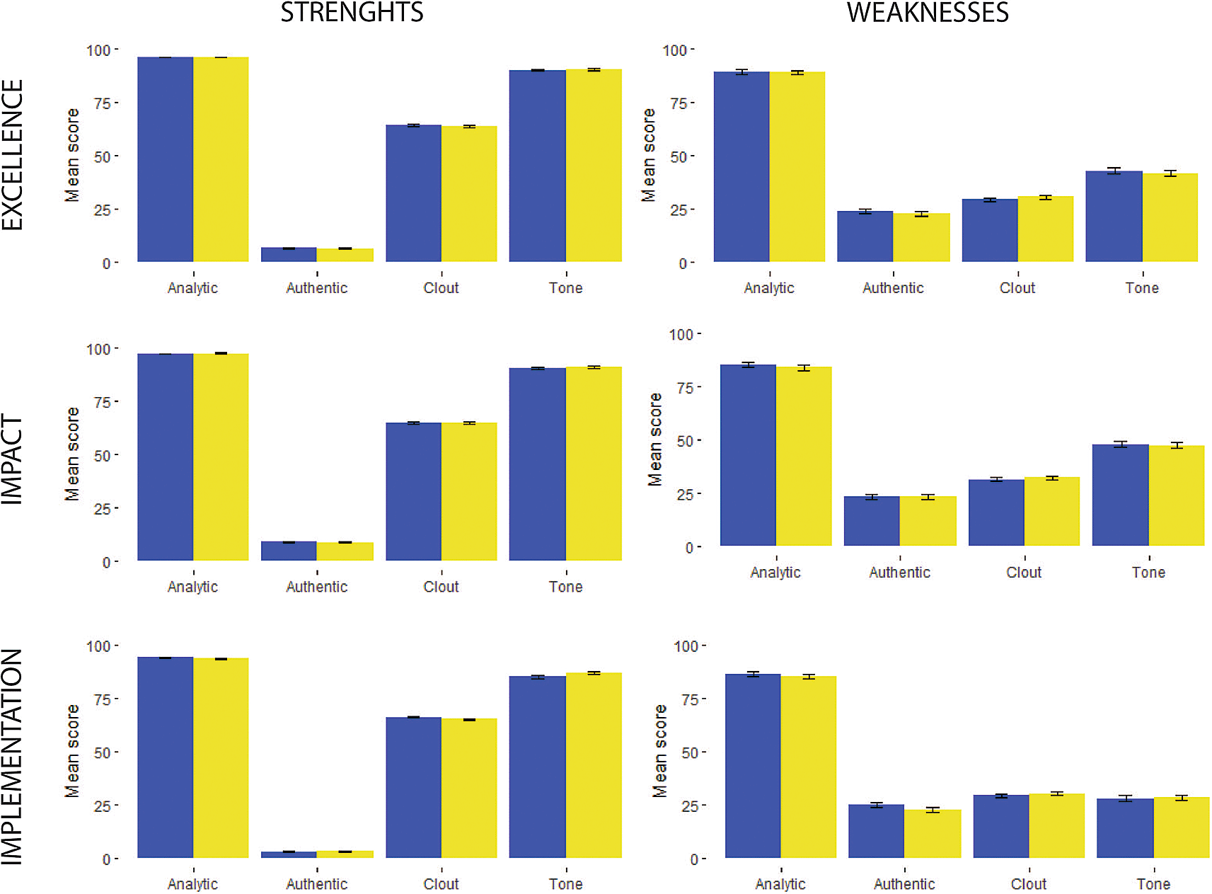 Overall, review comments were written predominantly in an analytic and objective language, which was indicated by the high level of Analytical tone and low levels of Authenticity; this indicates that a small proportion of reviewers formulated their arguments as personal opinions, rather than objective comments (Figures 1 and 2).