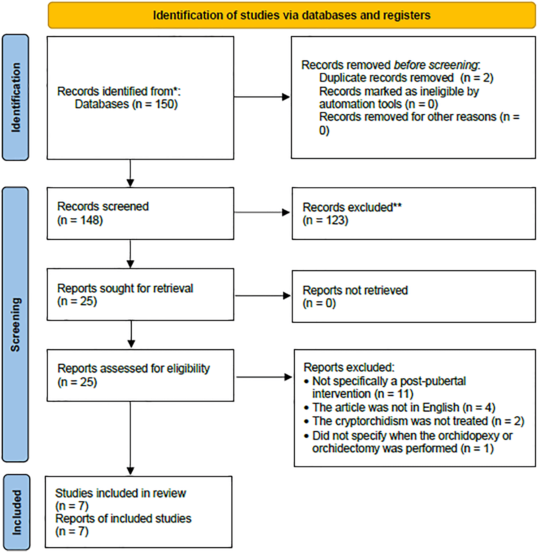 When UDT is not detected or corrected before the patient reaches puberty, there are specific guidelines regarding post-pubertal UDT. The European Association of Urology (EAU) guidelines recommend discussing orchiectomy in such cases with patients. However, this recommendation is weak and seems insufficient.4 Moreover, there is still a possibility of improving the fertility of patients with post-pubertal UDT. Recently, a systematic review conducted by Muncey et al.5 revealed that patients with uncorrected bilateral inguinal UDT retain the possibility of fertility after undergoing a post-pubertal orchidopexy. Therefore, adult patients with uncorrected UDT might reconsider orchidopexy instead of orchiectomy. In addition, to the best of the authors’ knowledge, there is no high-level evidence, such as systematic reviews or meta-analyses, regarding the management of post-pubertal UDT from the malignancy risk point of view so far. This study aimed to systematically review the available literature to provide valid recommendations for post-pubertal UDT management, with a focus on the risk of malignancy.