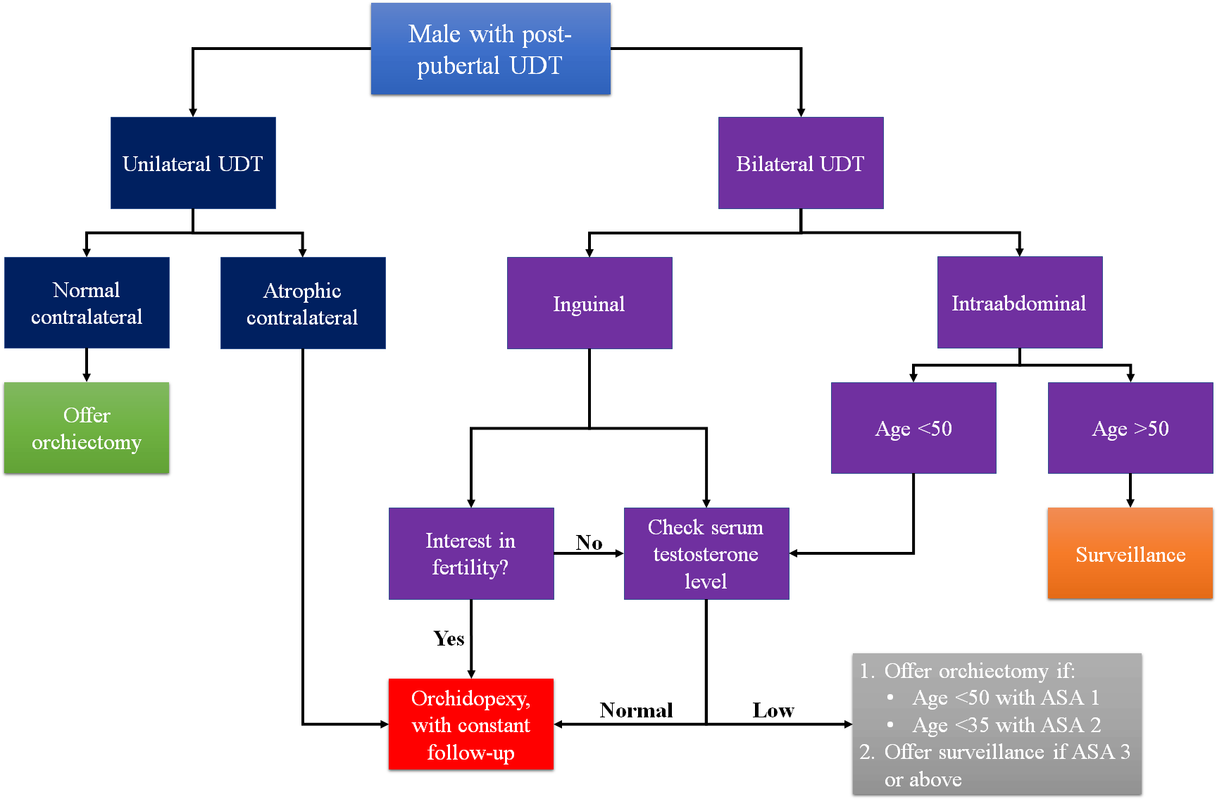 To conclude, in terms of malignancy risk, several factors should be considered when deciding post-pubertal UDT treatment, including the age of the patients, comorbidity of the patients, interest in fertility, and location of the testes. The authors recommend performing orchiectomy in post-pubertal unilateral UDT patients with normal contralateral testes, post-pubertal inguinal bilateral UDT patients that had no interest in fertility, and post-pubertal intraabdominal bilateral UDT patients aged less than 50 with no comorbidity or less than 35 with mild systemic disease. Otherwise, surveillance in patients older than 50 years old and orchidopexy in younger patients could still be considered. Therefore, it is important to clearly explain both the risks and possible benefits of both orchidopexy and orchiectomy to all post-pubertal UDT patients.