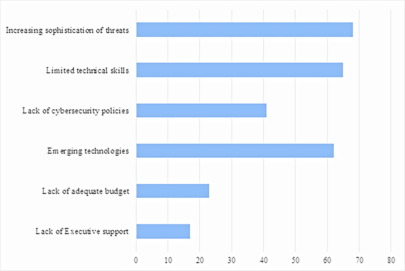 Figure 1 shows the top cybersecurity barriers, which include increasing sophistication of threats (89.5%), limited technical skills (85.5%) and emerging technologies (81.6%). The least ranked barriers are lack of executive support (22.4%), lack of adequate budget (30.3%) and lack of cybersecurity policies (53.9%).
