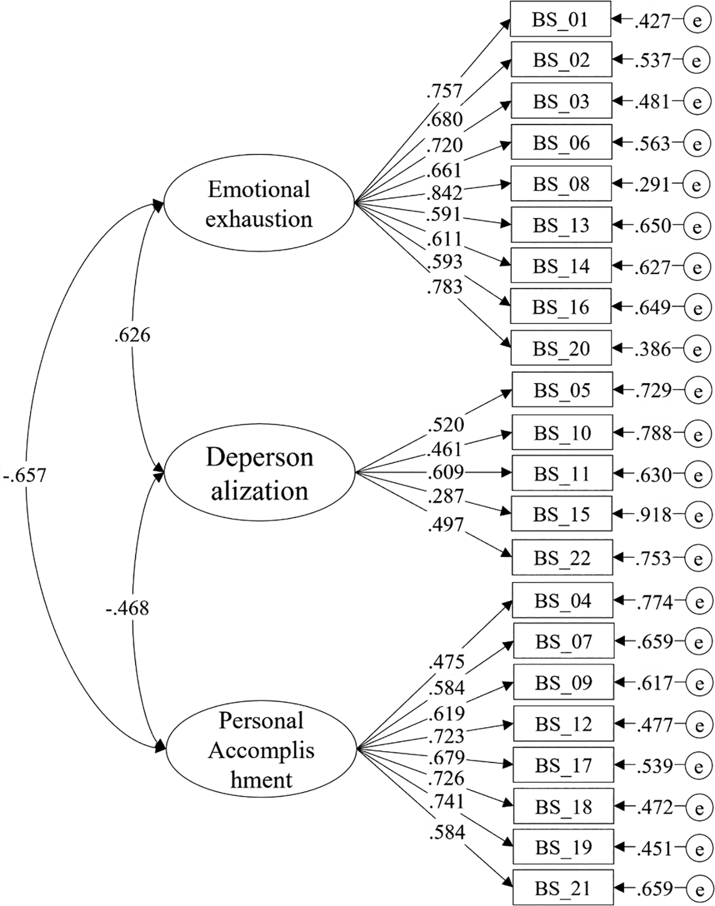 Consequently, the correlated three-factor model was analyzed, as shown in Table 5. Most items in this model possessed factor loadings greater than.40, with the exception of item BS_15, which had a factor loading of.287 (also seen in Table 5). Regarding the interrelation among the factors, significant and moderate correlation values were noted. The correlation between EE and DP stood at.626, between EE and PA was -.657, whereas the correlation between DP and PA was -.468, as depicted in Figure 1.