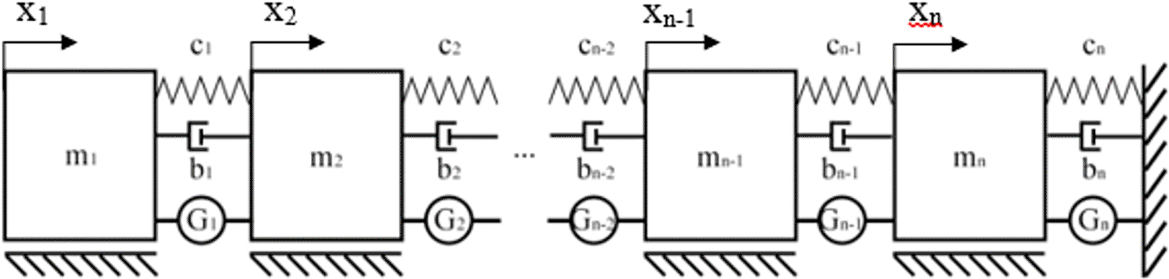 To verify the model in its current state, an intermediate electromotive force was also added at each stage. Its role was to simulate the actuation of piezoelectric plates by an electrical stimulus, similar to.15,25 The electromotive force acts as a simplified force generated by the electromechanical coupling used to describe the conversion of energy conversion between the mechanical and electrical part of a piezoelectric plate. The mechanical model with added damping and electromotive forces is shown in Figure 2.