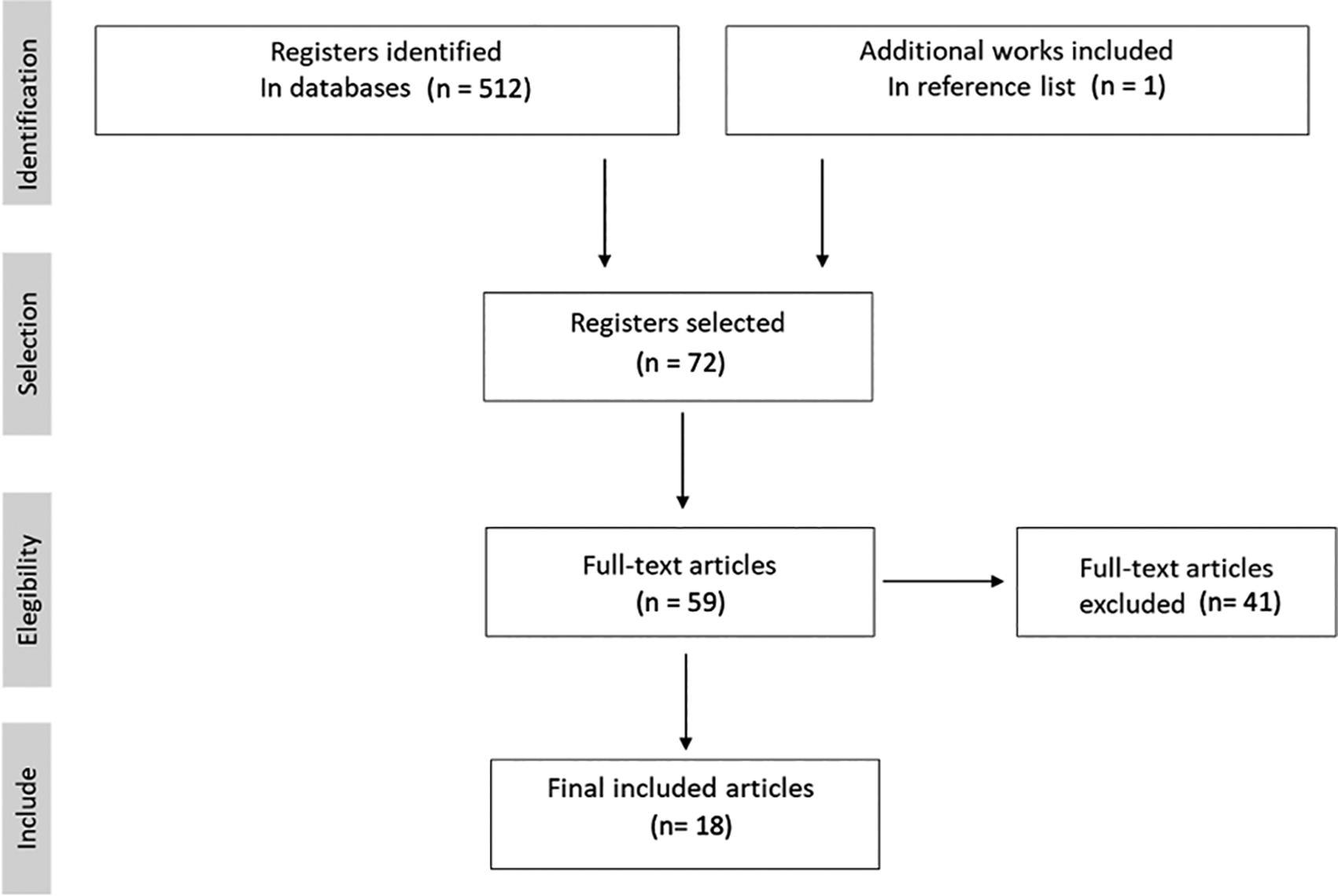 Searches were made using titles, abstracts and keywords. The first comprehensive search yielded a total of 512 records. One additional article was identified by other means. After removing duplicates, 72 documents were identified, of which 41 were excluded as they were not directly related to the objective of the study. Finally, 59 articles were reviewed and, after applying the inclusion criteria, the 18 articles included in this review were selected (Figure 1).