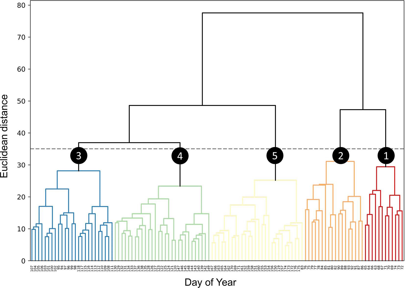 Dendrogram derived from hierarchical clustering of dates based on daily vocal activity. At a Euclidean distance threshold of 35 (indicated by the grey dashed line), five clusters are discerned (numbered circles).