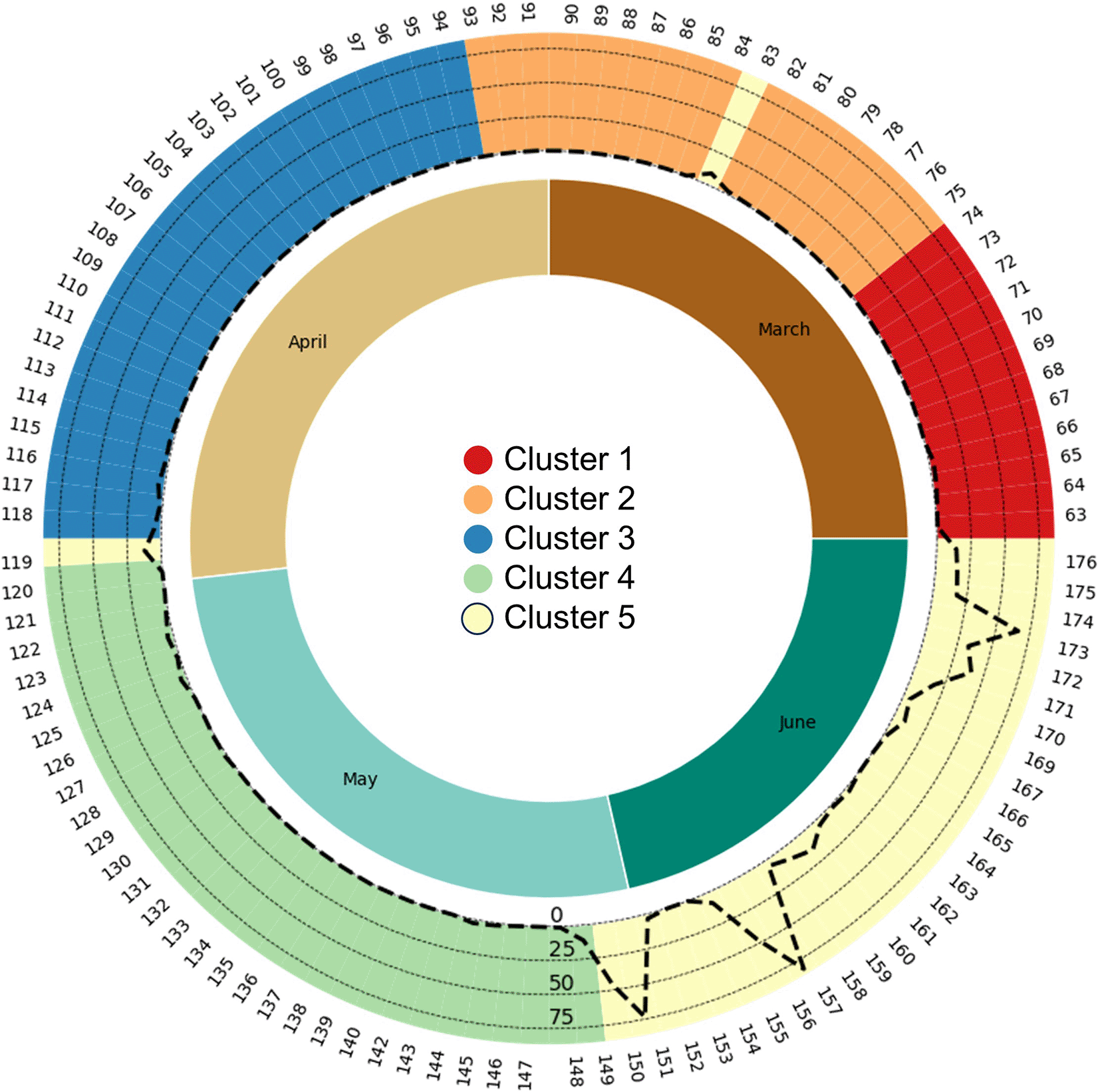 The outer ring indicates vocal activity clusters distinguished by colors: 1 (red), 2 (orange), 3 (blue), 4 (green), and 5 (yellow). Day of Year (DOY) is shown counterclockwise from the right on the ring's periphery. Within this ring, dashed lines represent rainfall (in mm) from the SCIH13 PAM station, centrally located in the survey area. Two outlier dates in Cluster 5 correspond to rainfall events. The inner ring denotes the months: March to June.