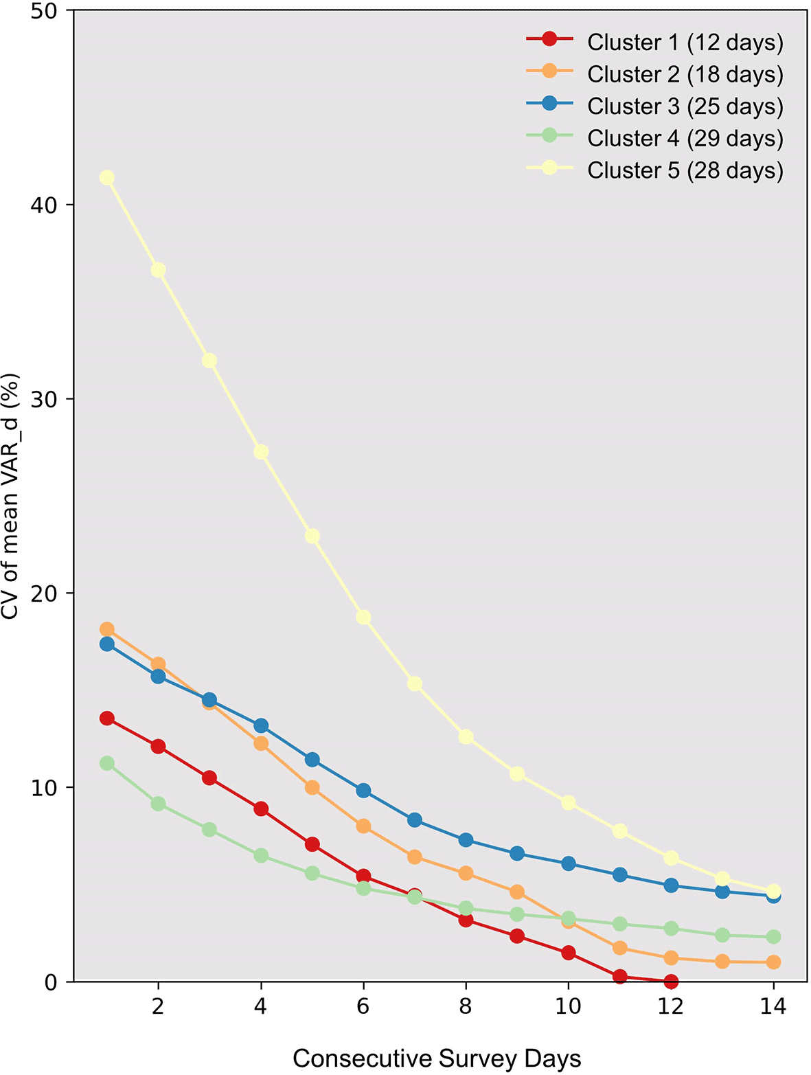 The graph displays the Coefficient of Variation (CV) against consecutive survey days (X-axis) for distinct clusters identified through hierarchical clustering (represented by colored lines). The number of days in each cluster is indicated in parentheses next to the cluster number in the legend. The Y-axis marks the CV values. Interpreting CV values for clusters 1 and 2 should be cautious, particularly for extended survey durations. Their limited days might result in artificially low CV values, potentially underestimating variation.