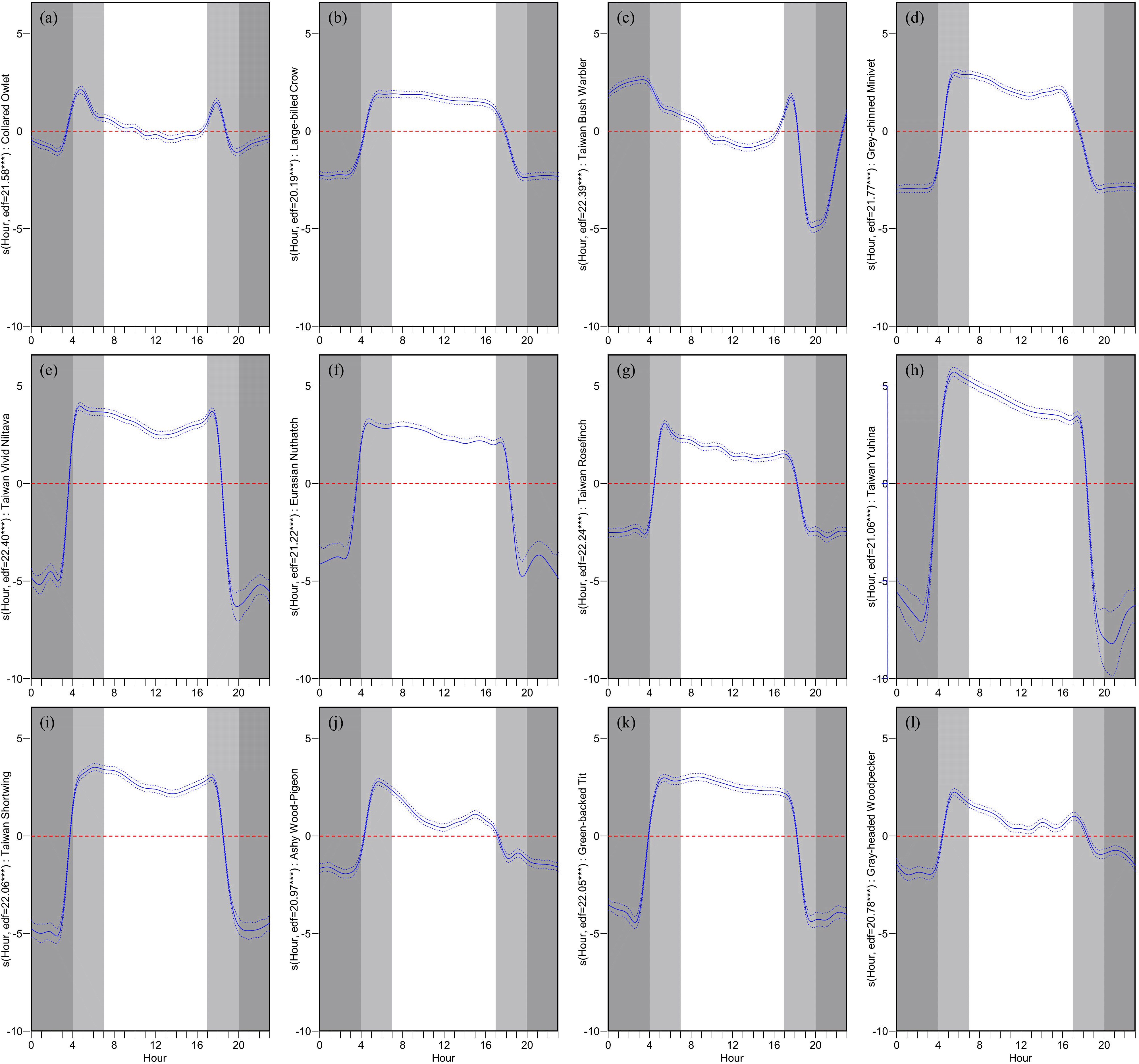Each panel displays the GAM-predicted relationship between the hour of the day and the hourly vocal activity rate (VAR_h) for a specific species: (a) Collared Owlet, (b) Large-billed Crow, (c) Taiwan Bush Warbler, (d) Grey-chinned Minivet, (e) Taiwan Vivid Niltava, (f) Eurasian Nuthatch, (g) Taiwan Rosefinch, (h) Taiwan Yuhina, (i) Taiwan Shortwing, (j) Ashy Wood-Pigeon, (k) Green-backed Tit, and (l) Gray-headed Woodpecker. The y-axis represents the smooth effect of hour on VAR_h for each species. The solid blue line represents the predicted deviation with a 95% confidence interval (blue dashed lines). A reference line is shown at Y=0 (red dashed line). A deep gray shade indicates nighttime, while dawn (approx. 4 AM to 7 AM) and dusk (approx. 5 PM to 8 PM) are highlighted in light gray, reflecting variations due to sunrise and sunset times over the study's four-month span. Accompanying each plot are the estimated degrees of freedom (edf) and significance codes (*** p < 0.001, ** p < 0.01, * p < 0.05).