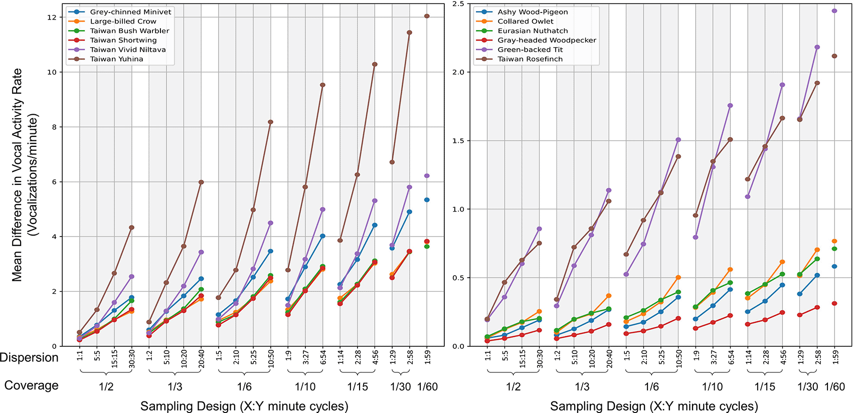 We examined the impact of diverse sampling strategies within an hourly timeframe on the VAR value per minute (VAR_m), concentrating on two main dimensions: coverage (representing the ratio of time recorded in an hour) and dispersion (indicating the number of recording intervals within an hour, with an X:Y format signifying cycles of X minutes of recording followed by Y minutes of inactivity). Based on seven coverage patterns, we formulated 21 unique sampling combinations for each hour, as elaborated in Table 1. For every species, date, and hour, we derived the mean VAR_m values from both continuous recordings and various sampling strategies, subsequently determining the difference between these values. In the end, we computed the average difference in VAR_m values across different species and sampling designs. A reduced mean difference indicates closer alignment between the VAR_m values from continuous recording and a particular sampling design.