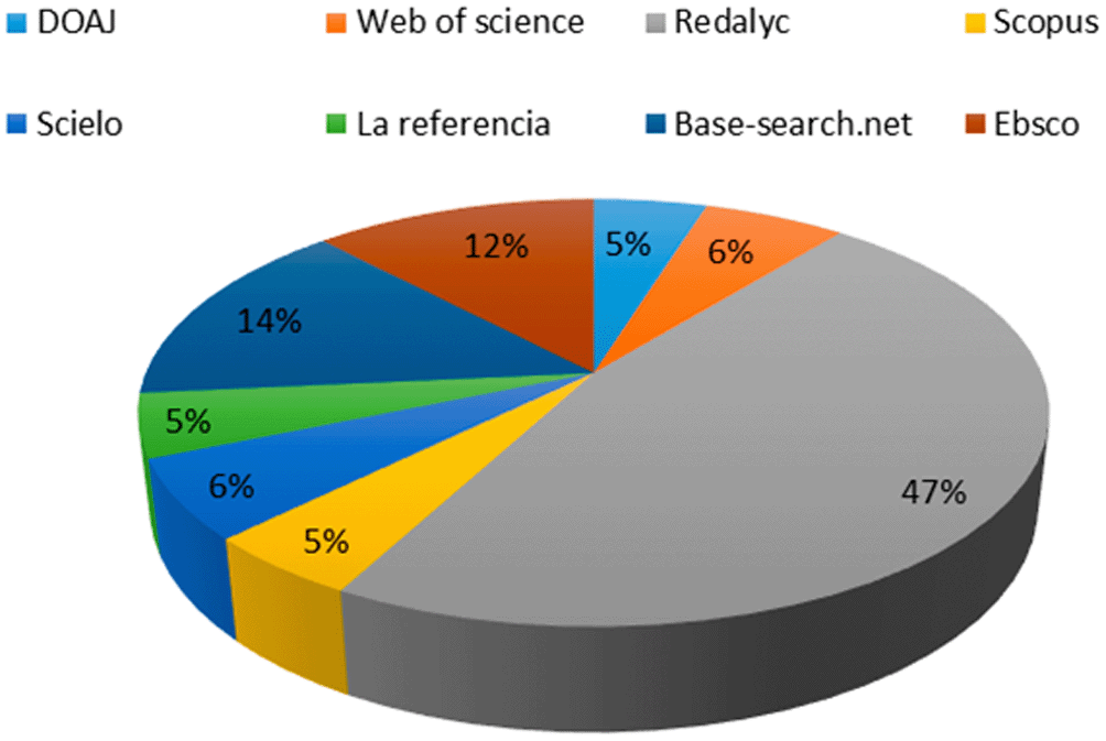 After the review, it was confirmed that the 83 articles contain the defined keywords in the fields of keywords, title, and/or abstract, verifying adherence. The representation of the used databases in obtaining the RBP is shown in Figure 1. It highlights that the Redalyc database contributes the highest number of articles to the RBP, accounting for 47% of the total. Base-search.net follows with 14%, while the remaining 39% of the RBP is derived from databases such as Web of Science, Scopus, Scielo, La referencia, DOAJ, Ebsco, Redalyc and Base-search.net.