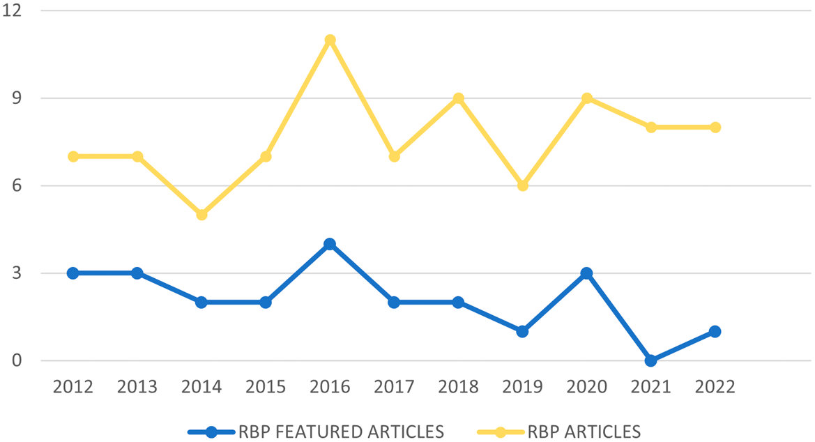 Figure 3 shows the number of articles from the RBP published in the period 2012-2022, as well as the number of highlighted articles from the RBP based on their citability, published within this time interval. It can be observed that the year 2014 marked a turning point in the decline of publications, reaching its peak in 2016, which also had the highest number of highlighted articles. However, this pattern does not repeat when considering the lowest number of published articles. For the RBP, the year with the lowest number of publications is 2014, while in terms of highlighted articles, the year with the fewest was 2021, where not a single article surpassed 10 citations.