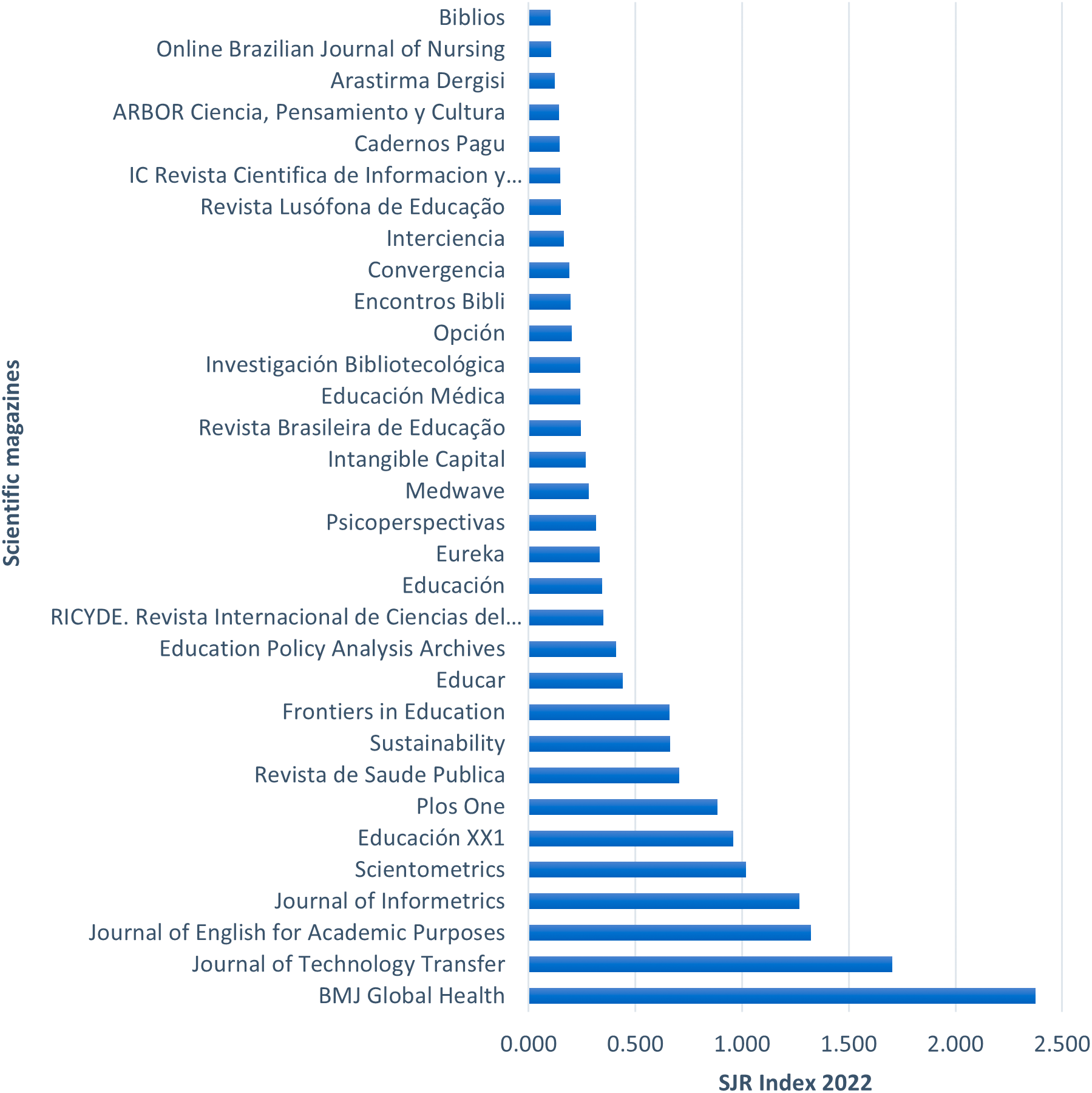 Figure 3 highlights the articles from the RBP according to the journals where they were published. The list includes 32 journals that published the respective articles from the RBP, ordered according to the Scimago Journal Rank (SJR) index, which measures the prestige of the journals based on the citation count received by each publication. Notable journals such as BMJ Global Health, Journal of Technology Transfer, and Journal of English for Academic Purposes stand out with SJR indexes of 2.37, 1.70, and 1.32, respectively. There is a significant difference of 0.67 points between the first and second-ranked journals. However, the subsequent journals show a smaller decrease in their scores, as seen in the difference of 0.38 points between the second and third-ranked journals. The journal with the lowest index is Biblios, with 0.10 points.