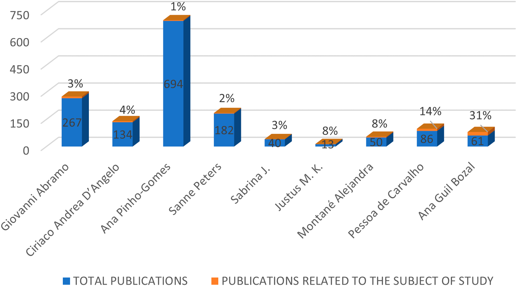 Along with the highlighted journals, information about the prominent authors in the RBP was also collected, selecting authors with the highest citability within the RBP, as shown in Figure 4. The figure compares the total number of publications of each author with the publications they have made related to the gender gap in research. Among these authors, Ana Pinho Gomes stands out with the highest number of total publications. Giovanni Abramo, Sanne Peters, and Ciriaco Andrea D’Angelo also have a percentage of their total publications related to the topic of study, with 1%, 3%, and 4% respectively. In contrast, authors such as Pessoa de Carvalho, Ana Guil Bozal, and Alejandra Montané have a smaller number of publications but a higher involvement in the subject at hand, with 14%, 31%, and 8% respectively.