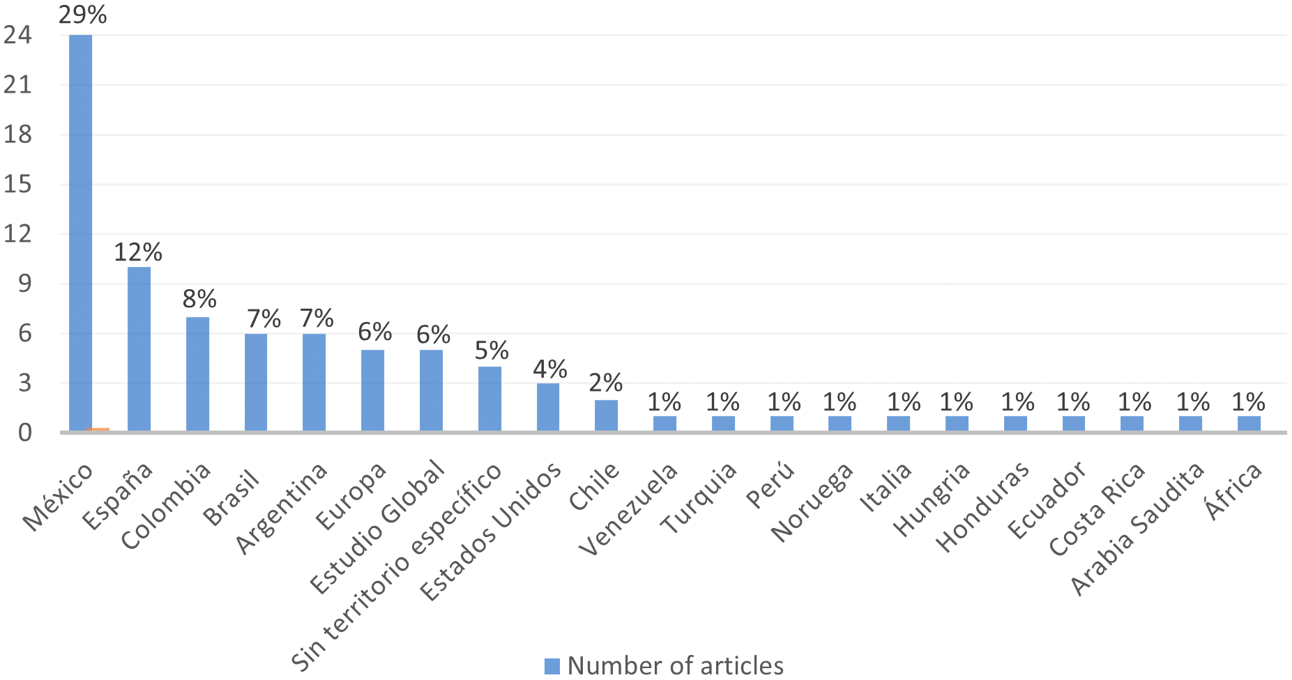 Based on the information recorded in Figure 5, the evidence indicates that the country with the highest number of studies related to the gender gap in research was Mexico (29%), significantly surpassing other territories. Spanish publications ranked second (12%), followed by Colombian (8%), Argentinean (7%), Brazilian (7%), European (6%), Global Studies (6%), publications without a specific territory (5%), United States (4%), Chile (2%), and to a lesser extent, Venezuela, Turkey, Peru, Norway, Italy, Hungary, Honduras, Ecuador, Costa Rica, Saudi Arabia, and Africa (1% each). This provides the study with global perspectives.