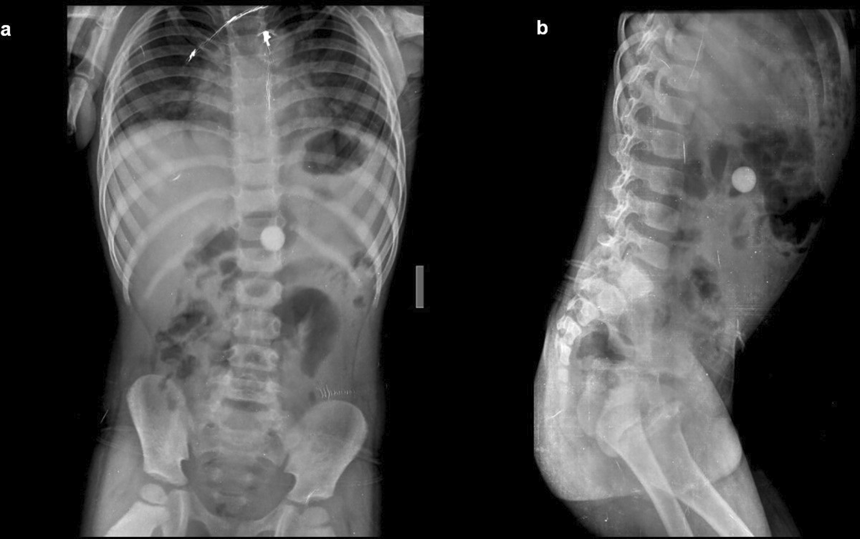 Case 1: A four-year-old child came with a history of abdominal pain. On a radiograph of the abdomen, frontal and lateral projections reveal circular radio opacity on the left side at the level of the L2-L3 disc suggestive of coin, which the patient had accidentally ingested. It passed through the gastro-intestinal tract without a problem.