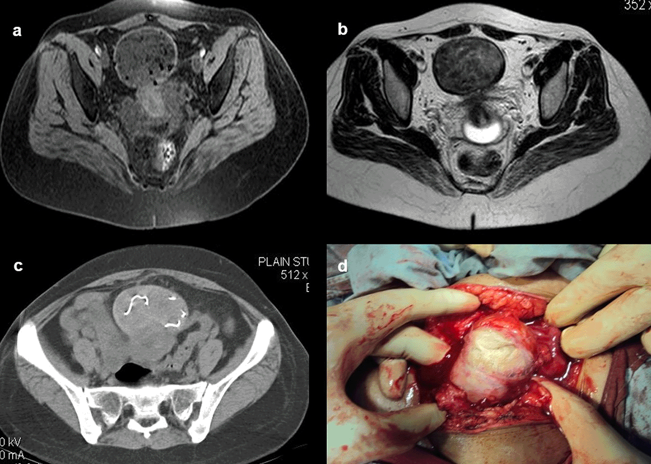 Case 10: A 33-year-old female came with a history of bleeding pervaginal for six months. MRI shows heterogeneous altered signal intensity soft tissue mass anterior to the uterus with multiple hypointense foci within. CT showed multiple linear metallic strings within a mass of soft tissue density anterior to the uterus, suggesting a foreign body (gossypiboma). The patient was operated on, and a large surgical sponge was removed.