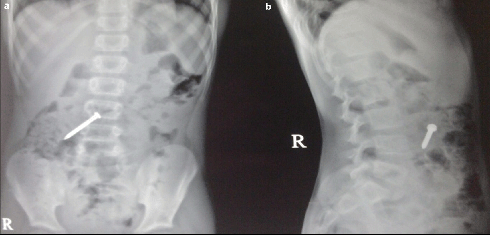 Case 2: A 34-year-old male carpenter by profession accidentally ingested a screw. A radiograph of the abdomen in frontal and lateral views reveals a nail at the level of the L4 and L5 vertebrae in the gastrointestinal tract, which passed without any problems.
