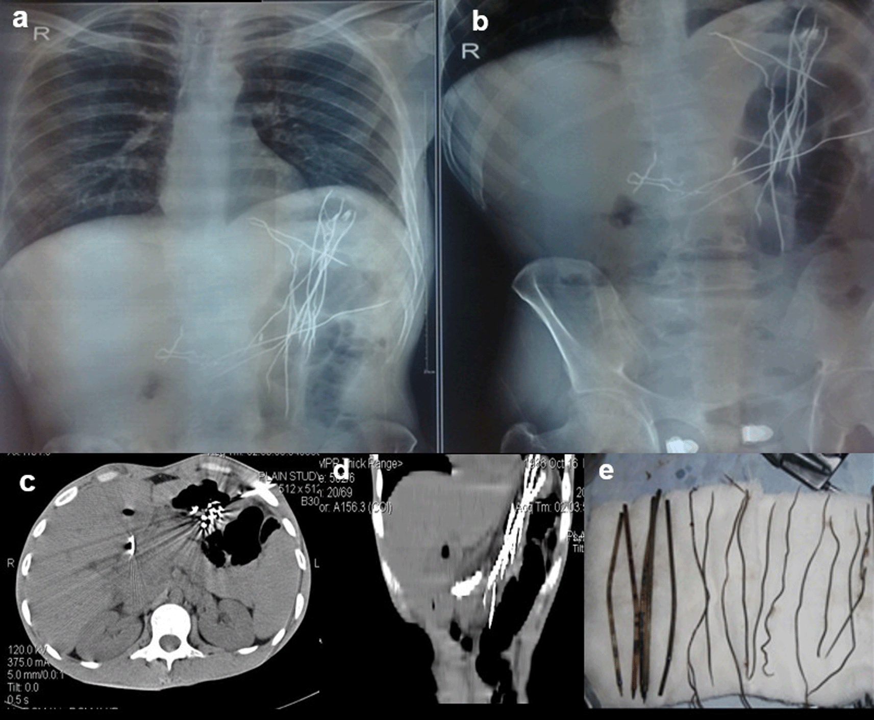 On laparoscopy, multiple refills of the pen and wires were found in the stomach, which were removed (e).
