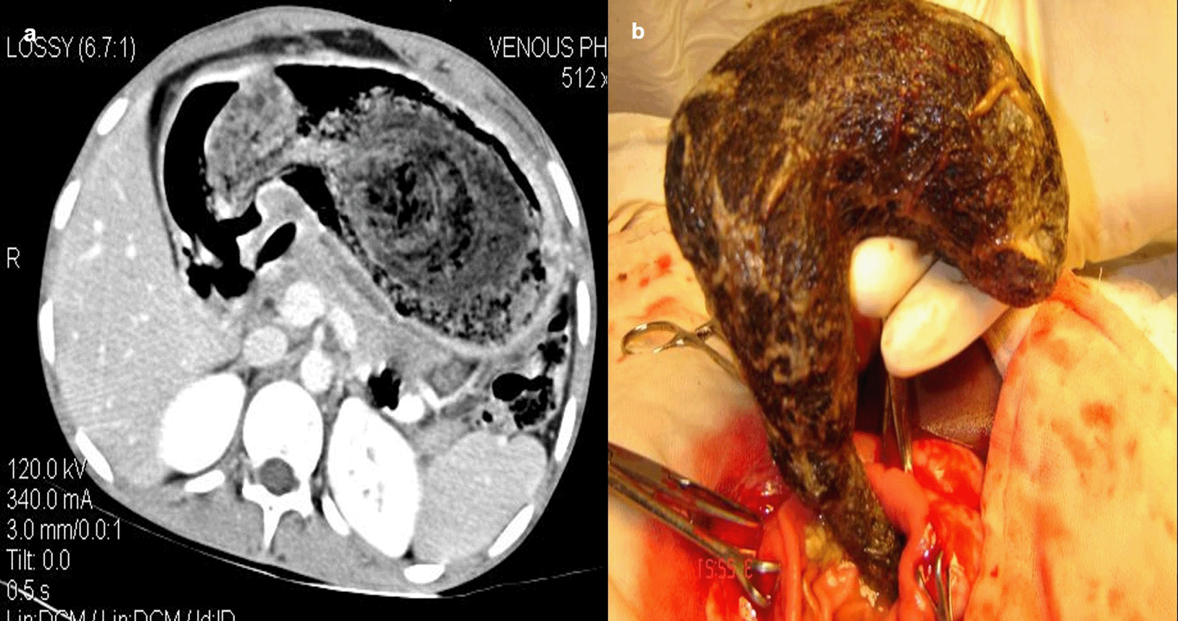 Gastrotomy revealed the ball of hair in the stomach (b).