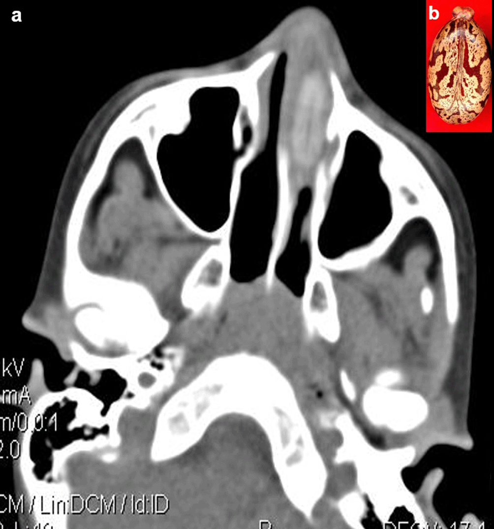 Case 5: A seven-year-old boy came with a history of epistaxis. CT paranasal sinuses (PNS) revealed a non-enhancing hyperdense lesion in the left nasal cavity, possibly a foreign body. It was removed under anaesthesia and found to be a castor seed.