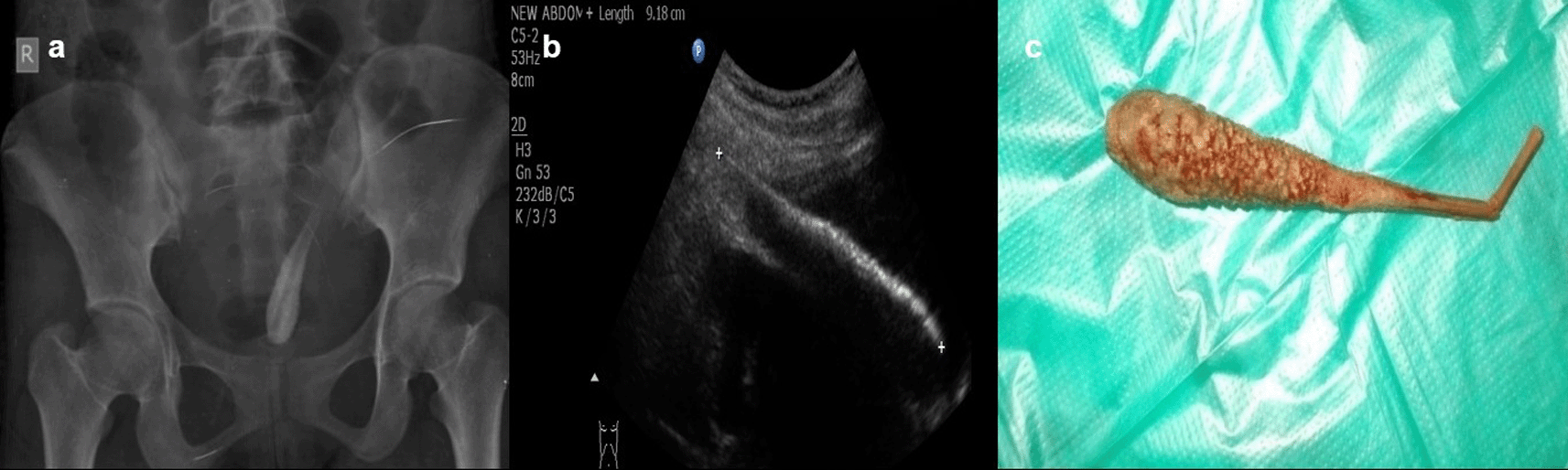 USG revealed a linear hyperechoic foreign body that penetrated the anterior wall of the bladder (b). The removed foreign body was a long wooden stick with cotton wrapped around it (c).